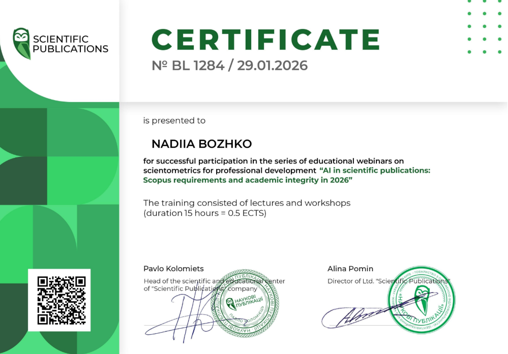 29 січня 2026 року викладачі Божко Надія Валеріївна та Синявін Олександр Миколайович взяли активну участь у вебінарі «ШІ в наукових публікаціях: вимоги Scopus і академічна доброчесність у 2026 році», присвяченому актуальним питанням використання штучного інтелекту в сучасній науковій діяльності.