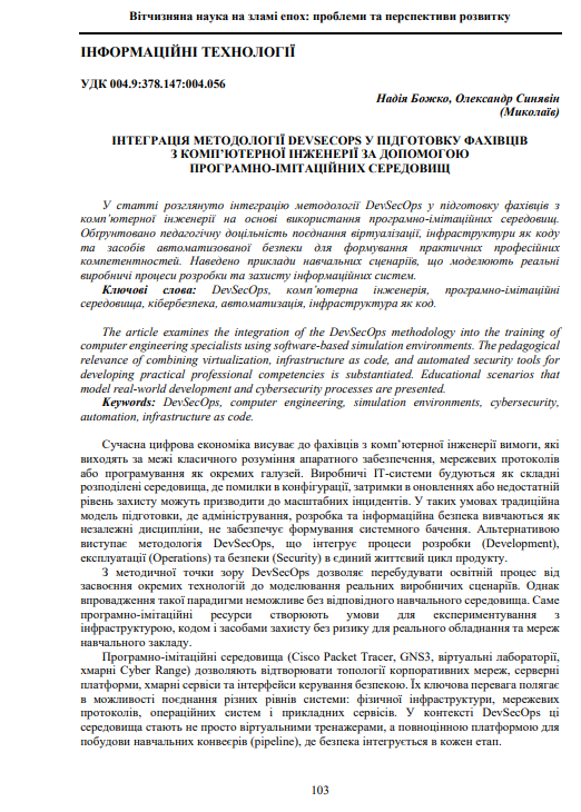 У статті автори обґрунтовують необхідність впровадження принципів DevSecOps (об’єднання розробки, безпеки та експлуатації) у навчальний план майбутніх фахових молодших бакалаврів. Основний акцент було зроблено на використанні програмно-імітаційних середовищ, які дозволяють студентам: