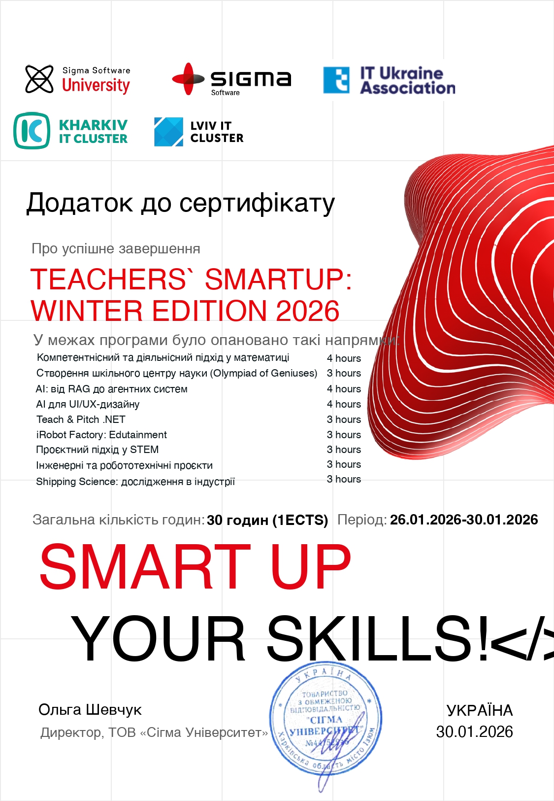 Викладачі коледжу Божко Надія Валеріївна та Синявін Олександр Миколайович успішно пройшли навчання на освітньому курсі Teacher’s Smart Up: Winter Edition 2026, організований ТОВ «Сігма Університет» у межах освітніх ініціатив, спрямованих на підвищення професійної кваліфікації викладачів та вчителів ІТ-дисциплін.