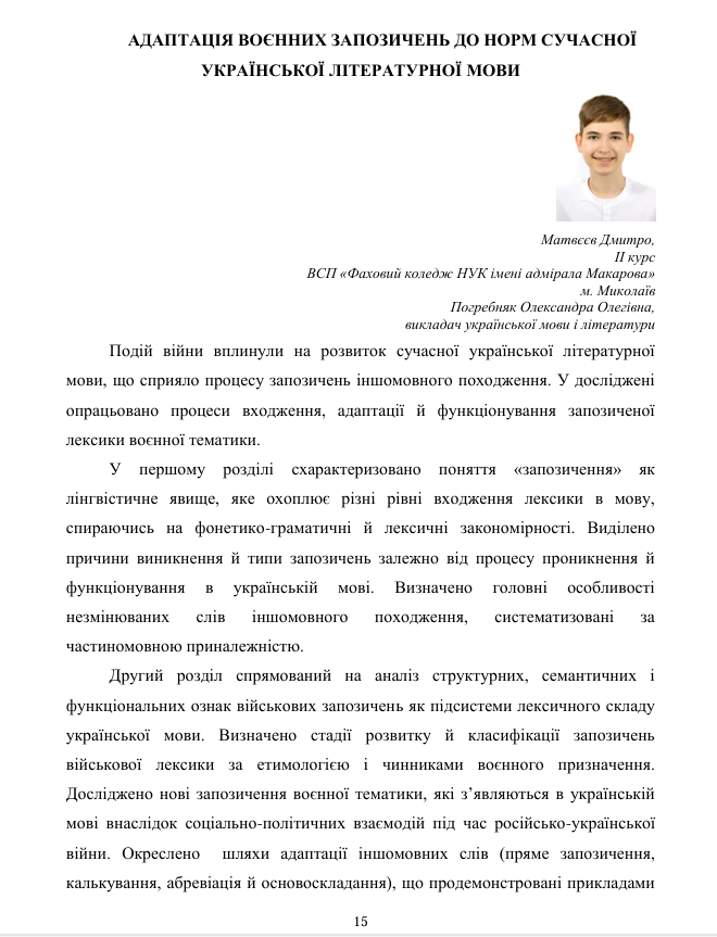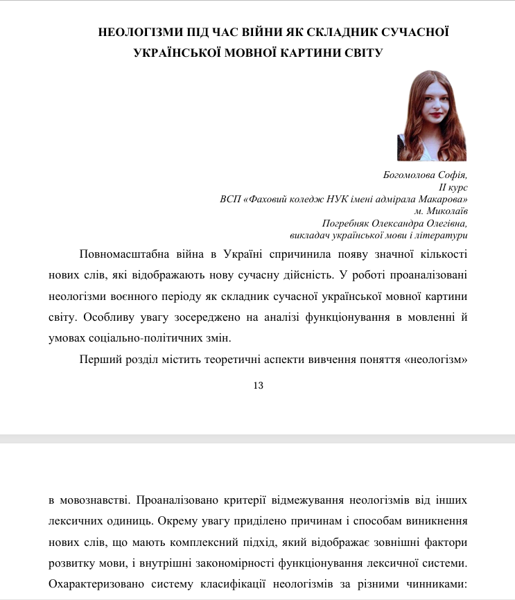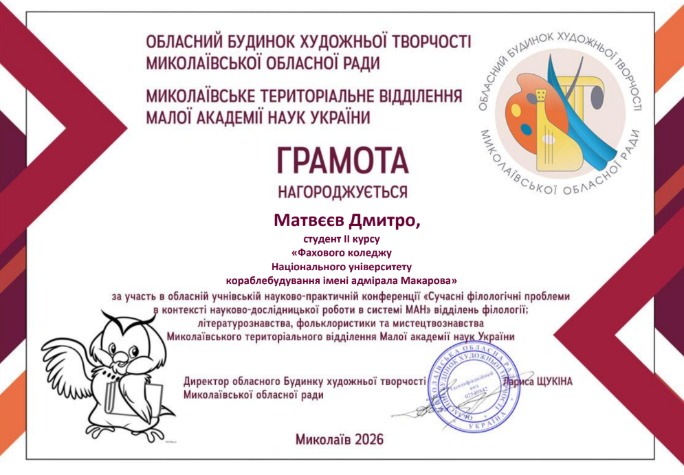 Студенти другого курсу: Богомолова Софія, Матвєєв Дмитро, Махиня Дарина – під керівництвом викладача української мови і літератури,Погребняк Олександри Олегівни, брали участь в обласній учнівській науково-практичній конференції «Сучасні філологічні проблеми в контексті науково-дослідницької роботи в системі МАН», яка проводилася в межах роботи відділень філології; літературознавства, фольклористики та мистецтвознавства Миколаївського територіального відділення Малої академії наук.