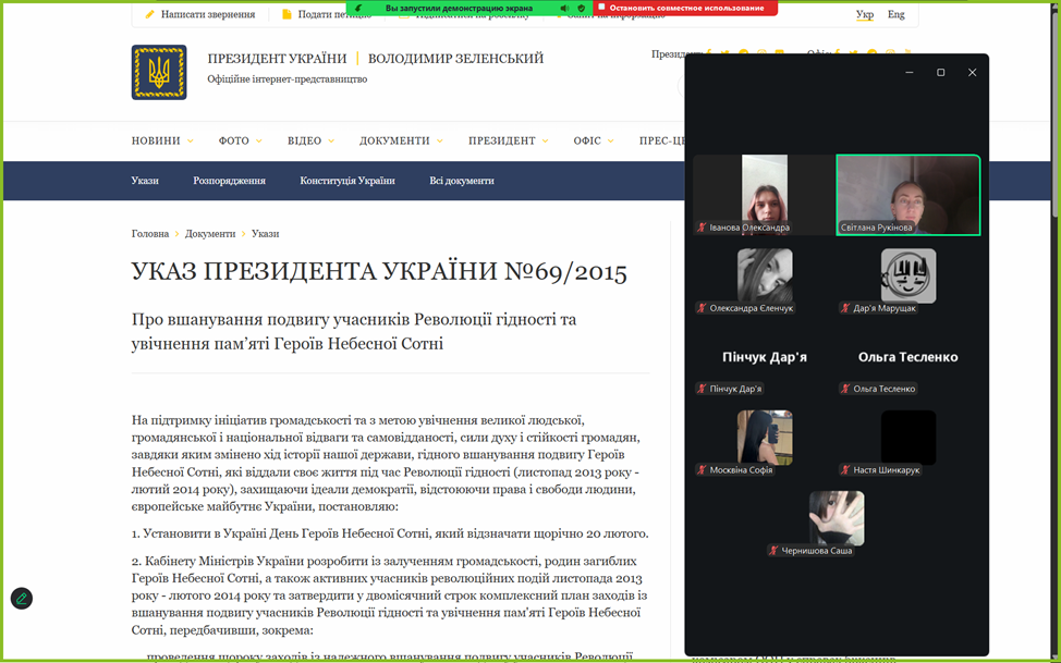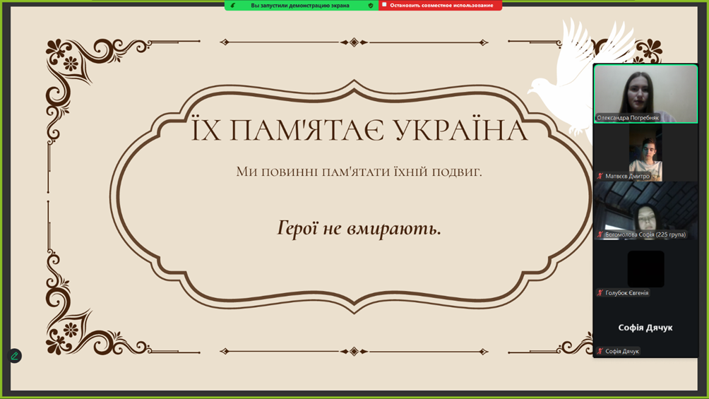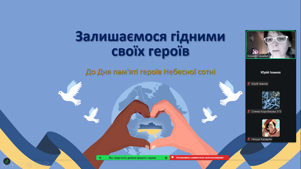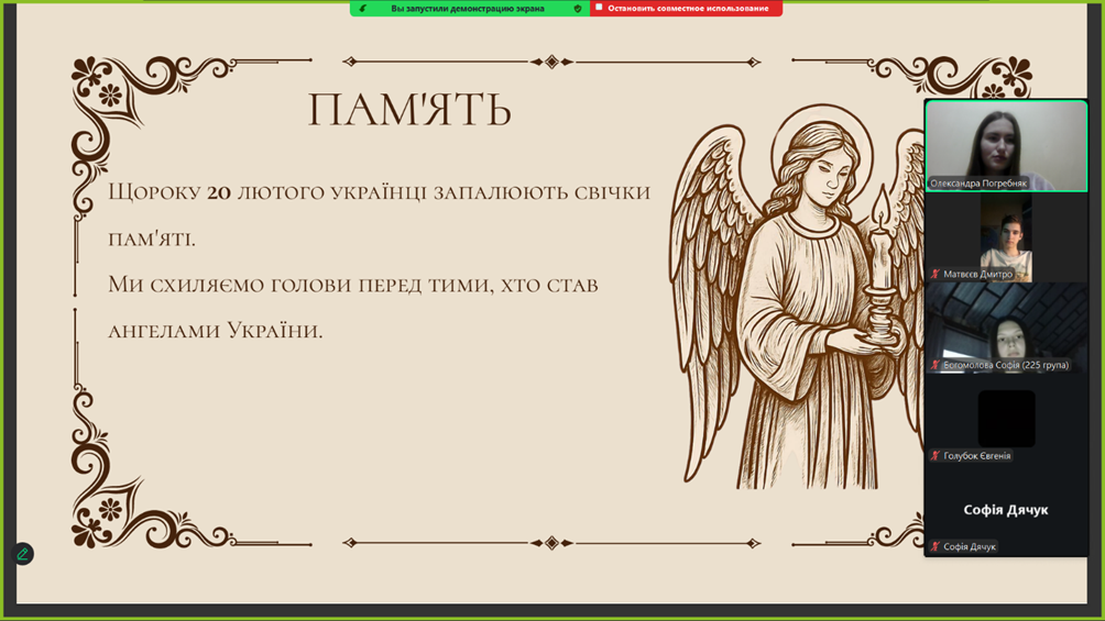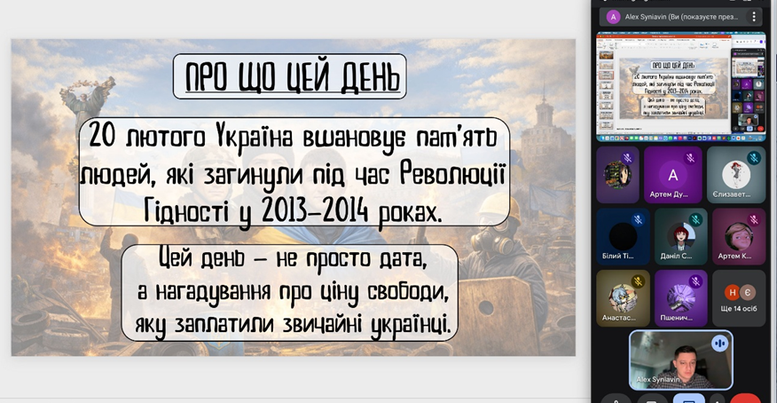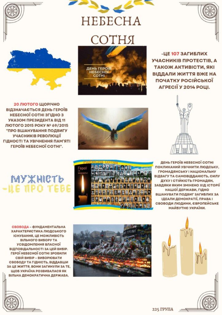 Крім того, кураторами академічних груп (Санайко К.М., Погребняк О.О., Рукіновою С.С., Синявіним О.М.) було проведено виховні години, під час яких здобувачі освіти та викладачі згадали тих Героїв, сміливість та віра в Україну яких надихає молоді покоління на сьогоднішню боротьбу з ворогом, на відстоювання незалежності та права українців на власний вибір.