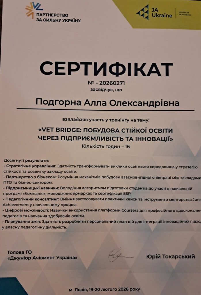19–21 лютого 2026 року у Львові викладачка нашого коледжу, Подгорна Алла Олександрівна,стала учасницею інтенсивного тренінгу для педагогів «VET Bridge: побудова стійкої освіти через підприємливість та інновації», організованому у межах програми «Партнерство за сильну Україну» спільно з JA Ukraine.