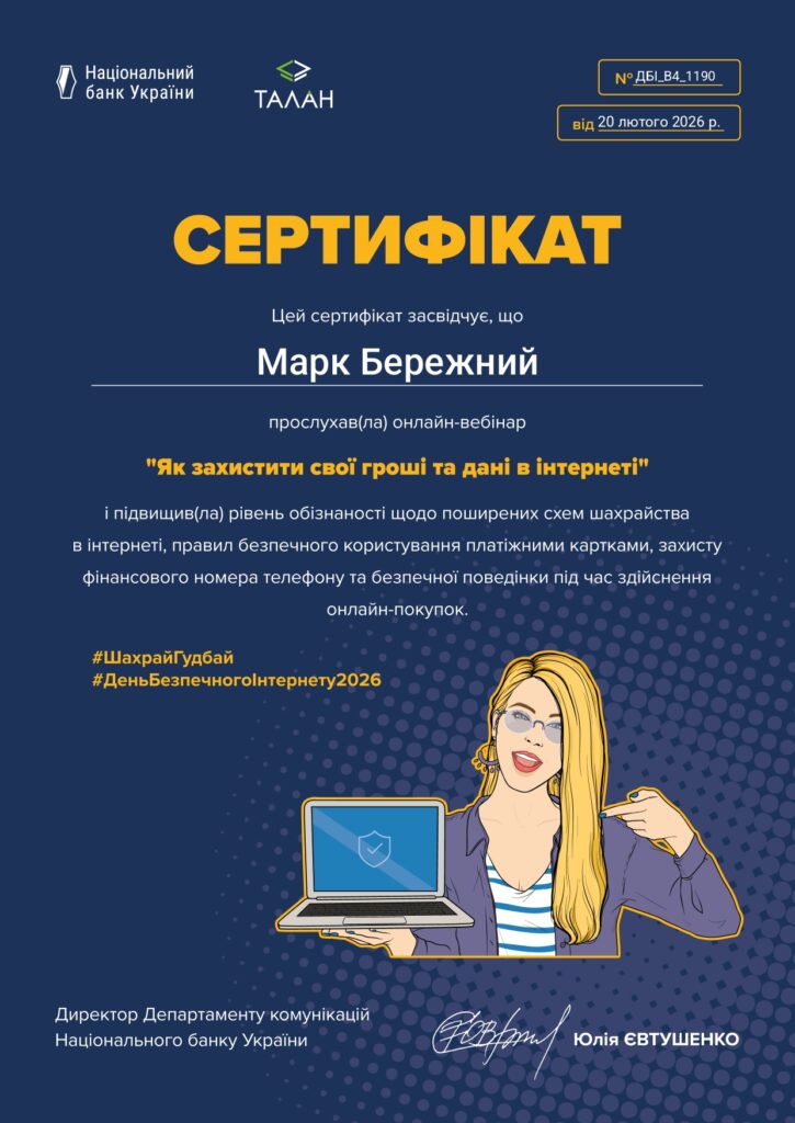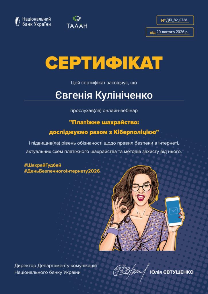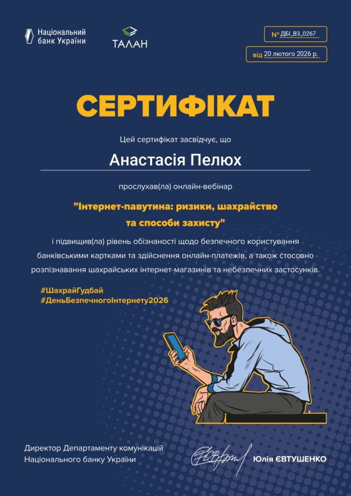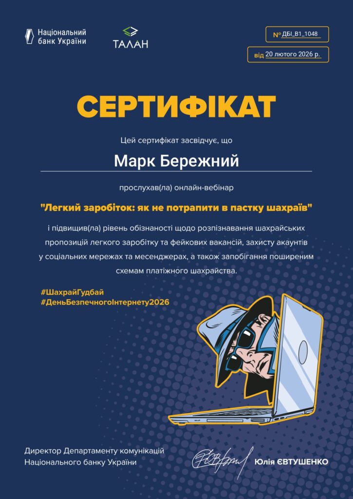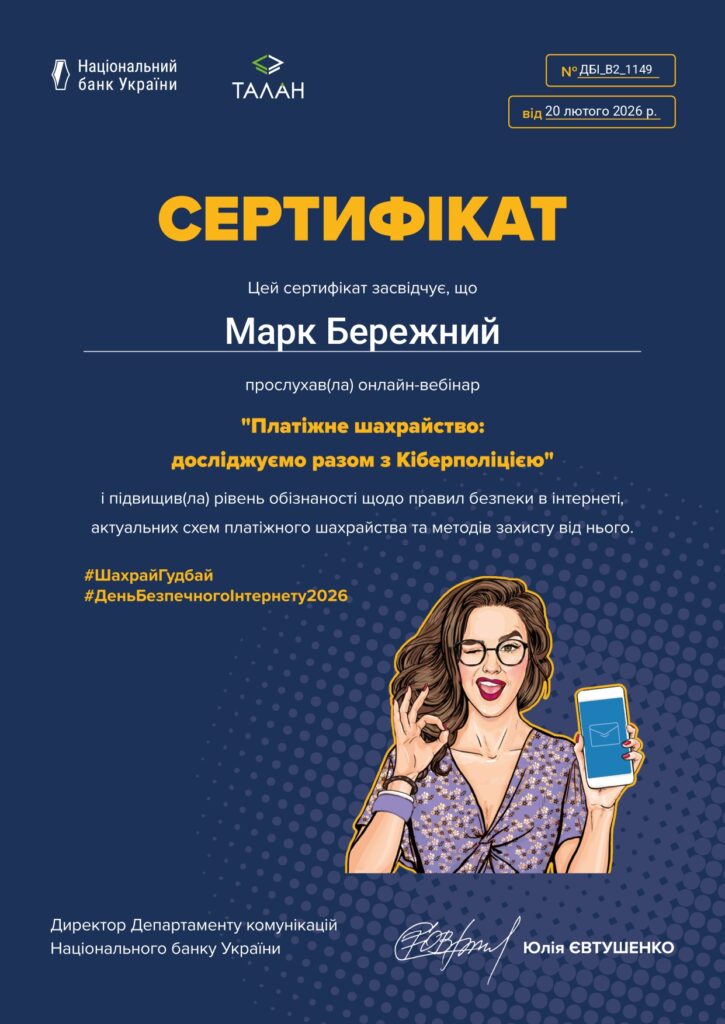 Студенти спеціальності 123 «Комп’ютерна інженерія» разом із викладачами Синявіним Олександром та Божко Надією стали активними учасниками серії вебінарів з платіжної безпеки, що відбулися з 09 по 13 лютого 2026 року в межах масштабної інформаційної кампанії від Національного банку України. Головною метою інтенсиву було озброїти молодь та освітян знаннями для протидії фінансовому шахрайству та захисту персональних даних у цифровому світі.