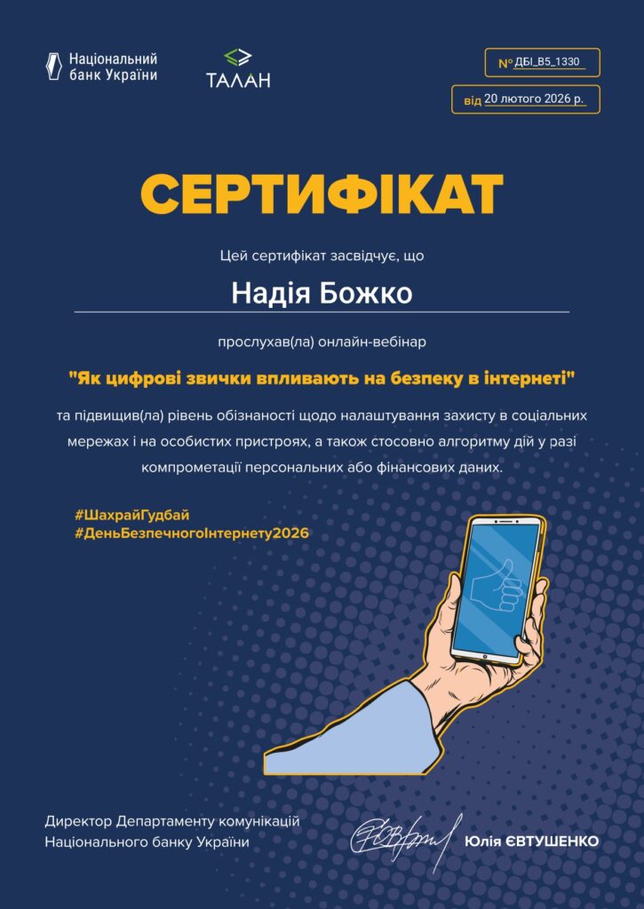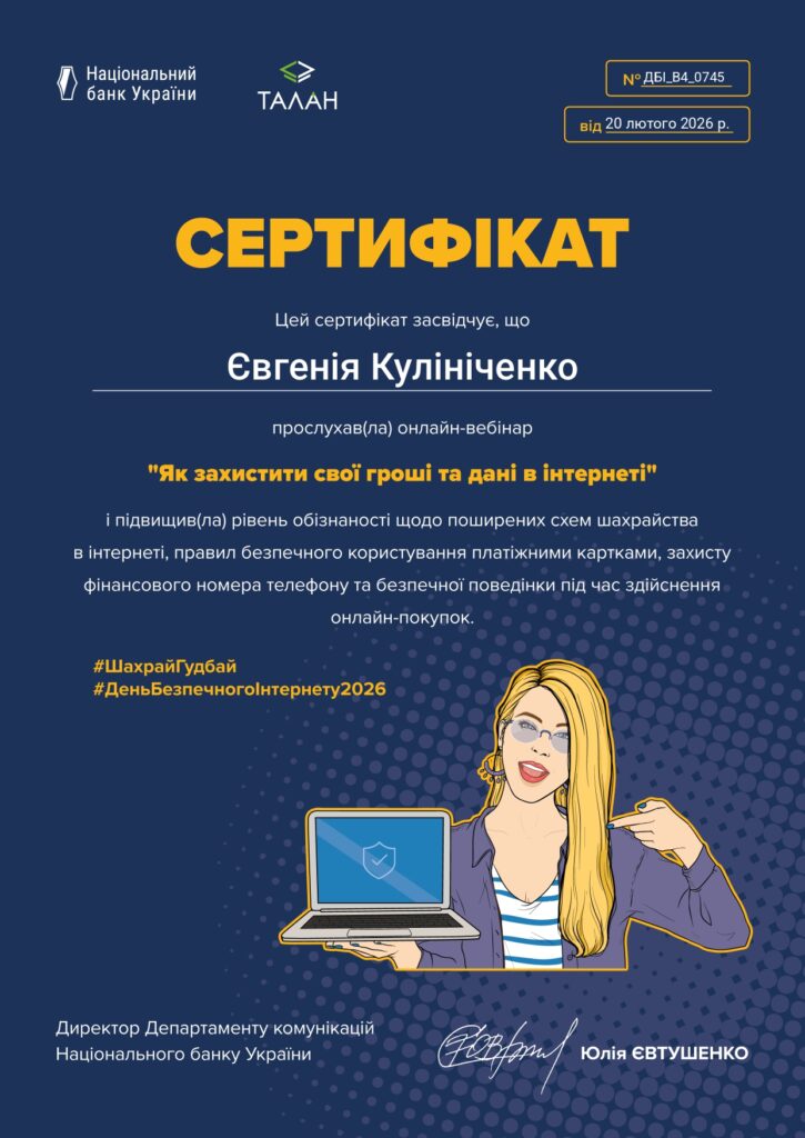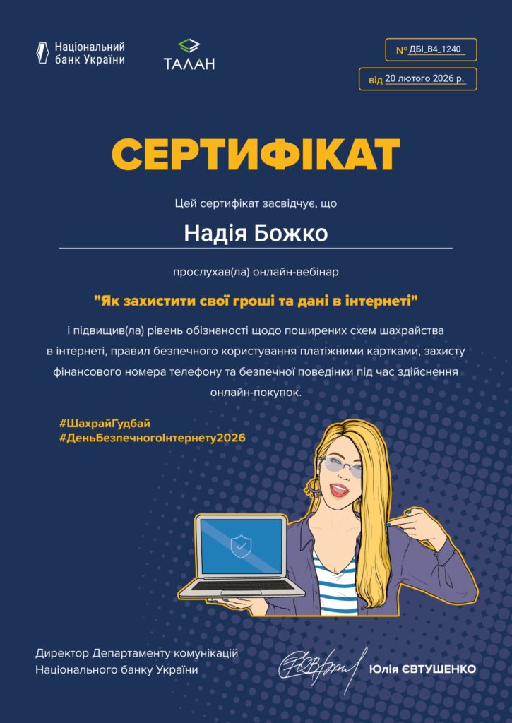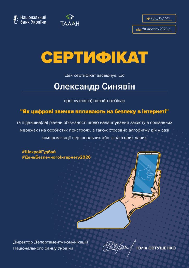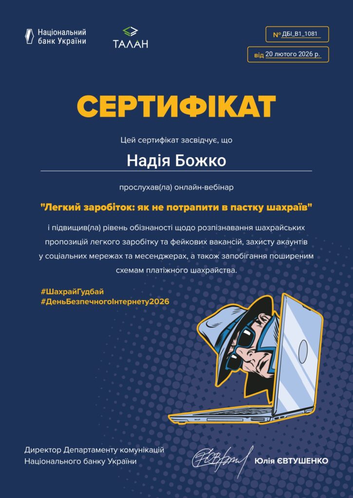 Студенти спеціальності 123 «Комп’ютерна інженерія» разом із викладачами Синявіним Олександром та Божко Надією стали активними учасниками серії вебінарів з платіжної безпеки, що відбулися з 09 по 13 лютого 2026 року в межах масштабної інформаційної кампанії від Національного банку України. Головною метою інтенсиву було озброїти молодь та освітян знаннями для протидії фінансовому шахрайству та захисту персональних даних у цифровому світі.