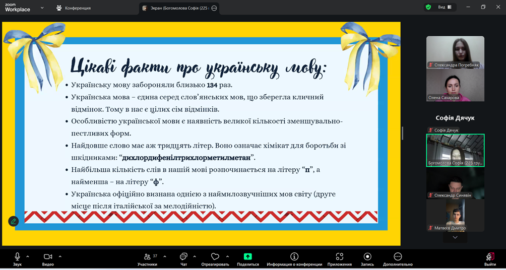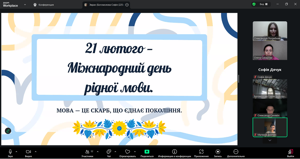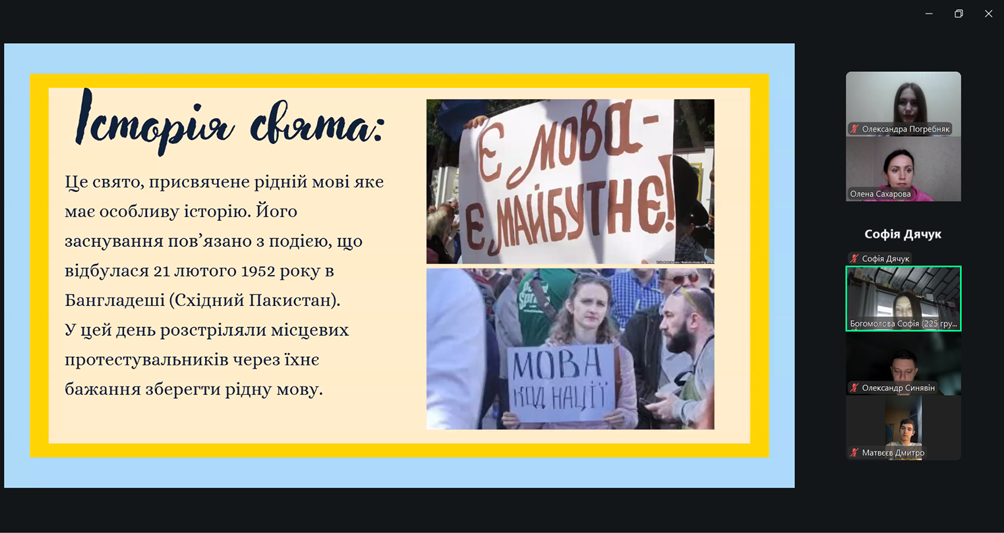 Під час зустрічі Софія ознайомила присутніх з історією свята, започаткованого рішенням ЮНЕСКО у 1999 році з метою підтримки мовного й культурного різноманіття та збереження мов, що перебувають під загрозою зникнення. Студенти дізналися про передумови встановлення пам’ятної дати та її значення для розвитку національної самосвідомості.