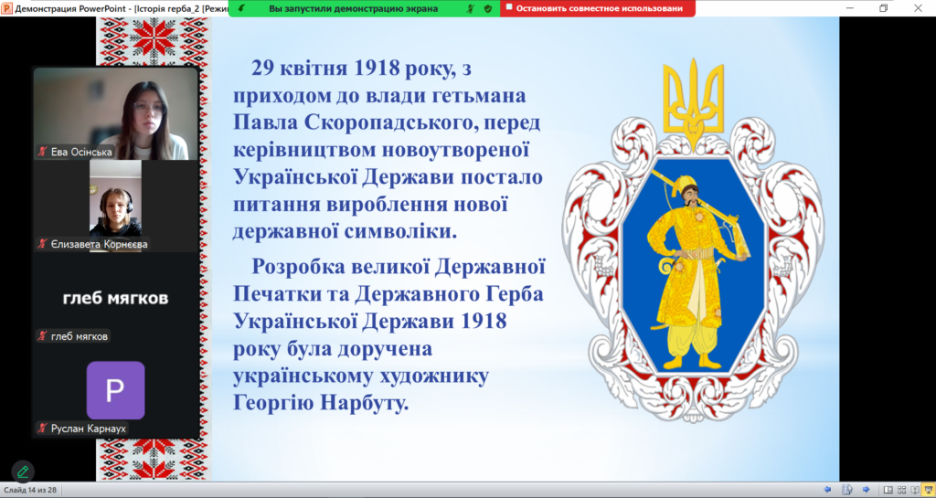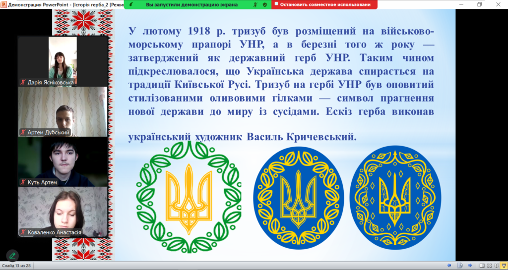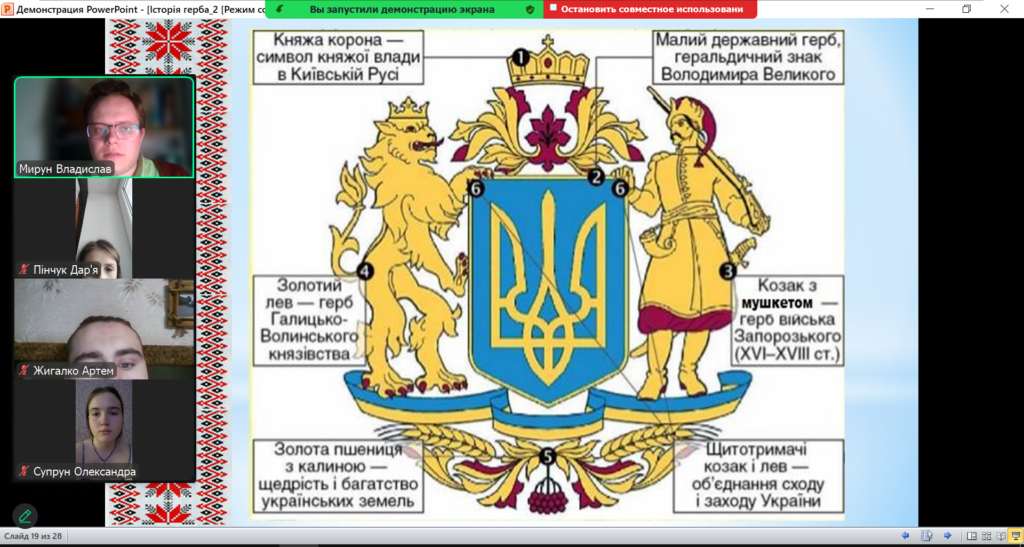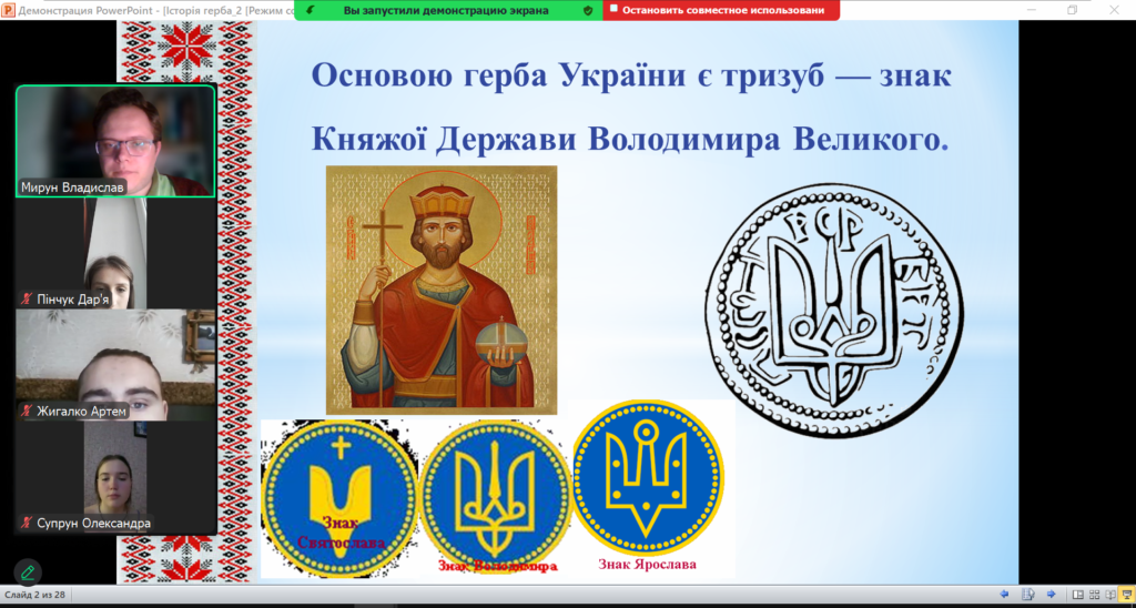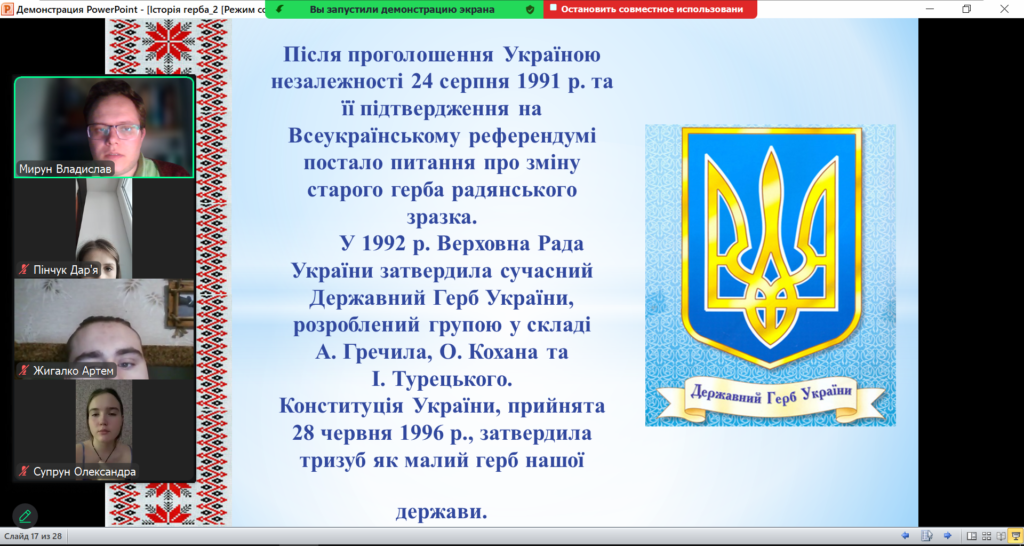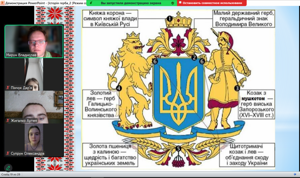 Викладач історії Мирун Владислав Віталійович провів виховний захід для здобувачів освіти І курсу, присвячений історії становлення Державного герба України, його значенню та ролі в житті держави.