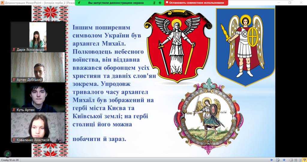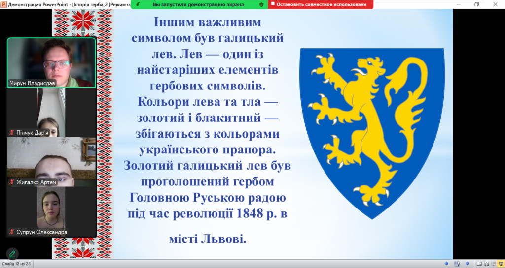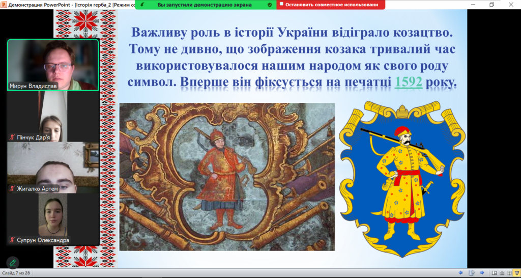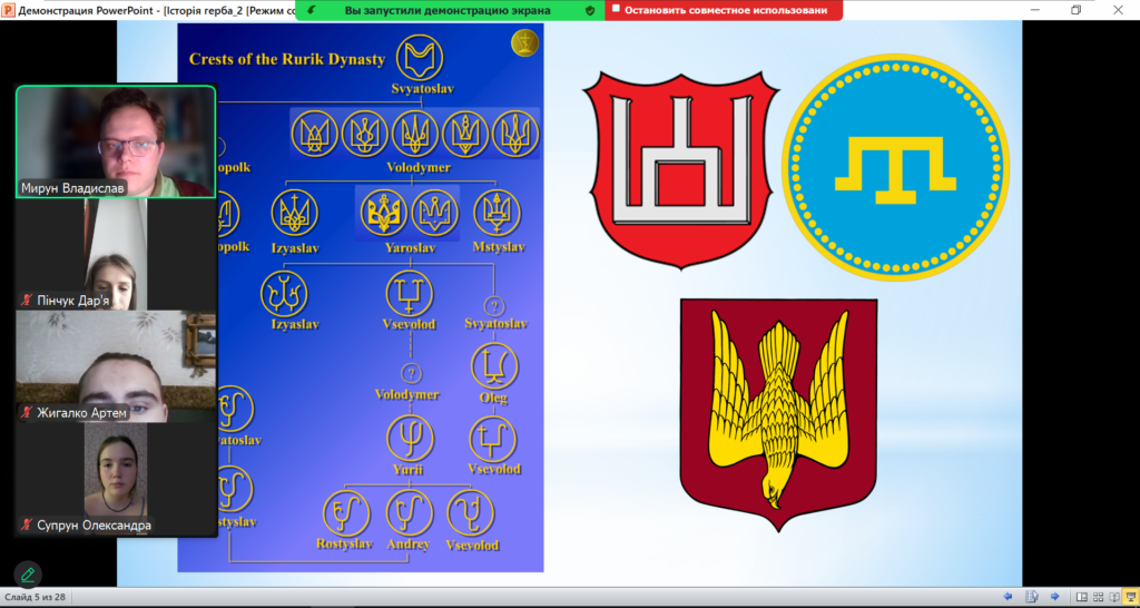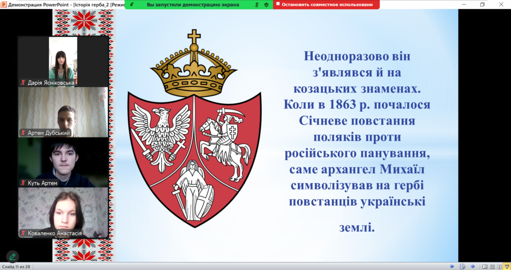 Викладач закцентував увагу на державній символіці українських земель у період Середньовіччя та Нового часу: Золотий галицький лев – герб Руського королівства, Запорожець з самопалом – герб Війська Запорозького, Святий Архангел Михаїл – герб Київщини.