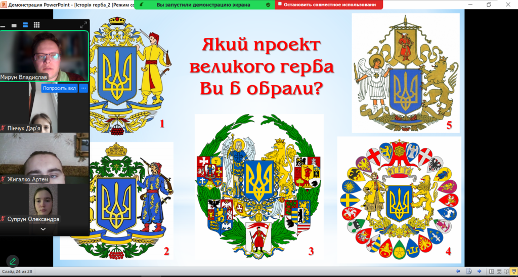 Наприкінці заходу здобувачі ознайомилися з проєктами Великого Державного Герба України, що передбачений Конституцією та мали нагоду обрати найкращий варіант шляхом анонімного голосування.