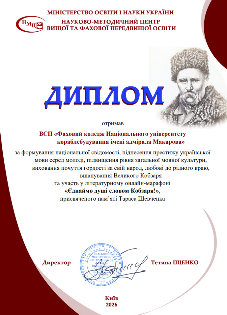Студенти І і ІІ курсів під керівництвом викладачки української мови і літератури, Погребняк Олександри Олегівни, долучилися до літературного онлайн-марафону, організованого Науково-методичний центр вищої та фахової передвищої освіти, який проходив 02–07 березня 2026 року й був присвячений пам’яті Тараса Шевченка.