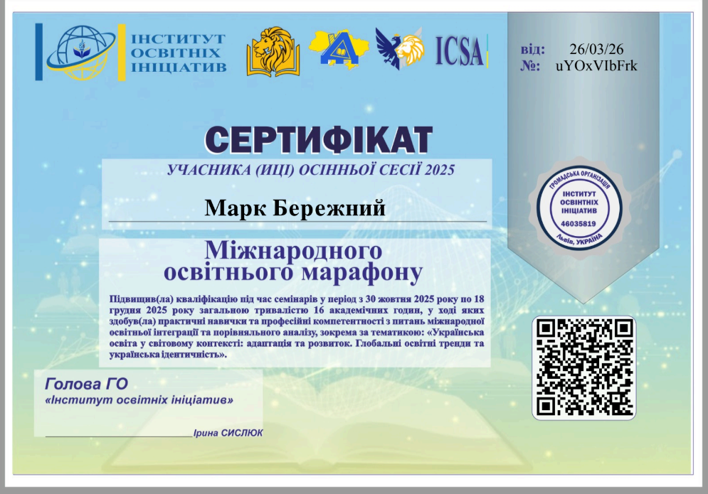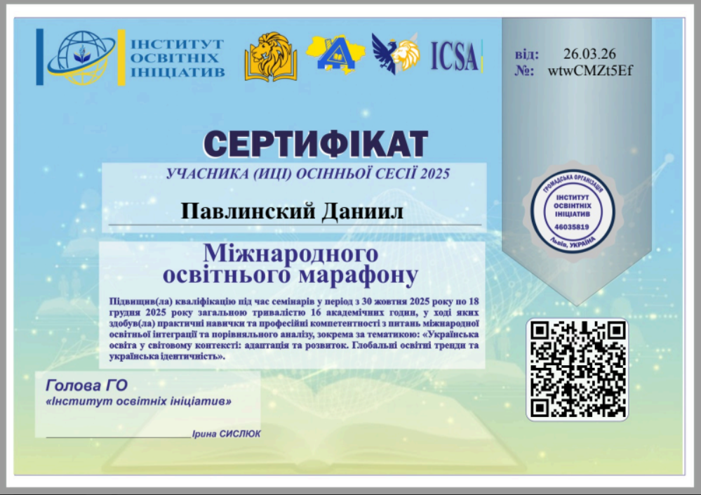 Світ технологій не стоїть на місці, і ми – разом із ним! Команда нашого коледжу у складі студентів груп спеціальності «Комп’ютерна інженерія» та викладачів Божко Надії Валеріївни і Синявіна Олександра Миколайовича успішно завершила цикл навчання в межах Міжнародного освітнього марафону, організованого ГО «Інститут освітніх ініціатив» у місті Львові.