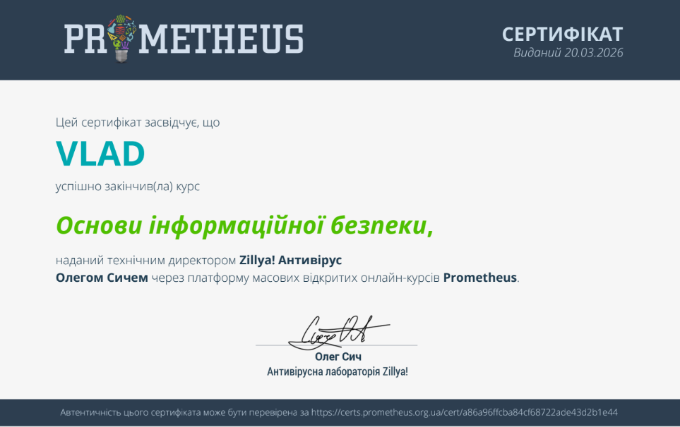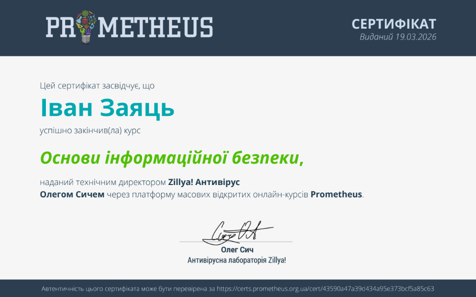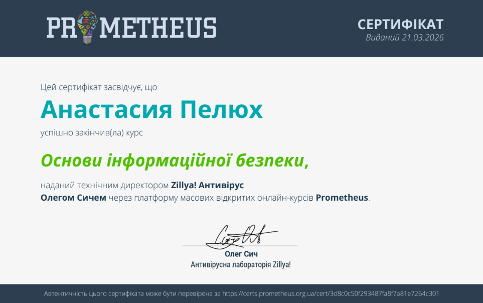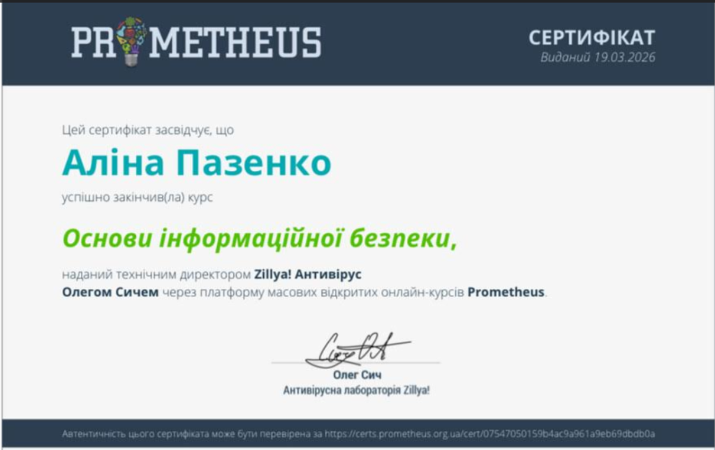 В межах вивчення дисципліни «Захист інформації в комп’ютерних системах» студенти 455 групи спеціальності 123 «Комп’ютерна інженерія» під керівництвом викладача Божко Надії Валеріївни успішно пройшли курс «Основи інформаційної безпеки» на платформі Prometheus.