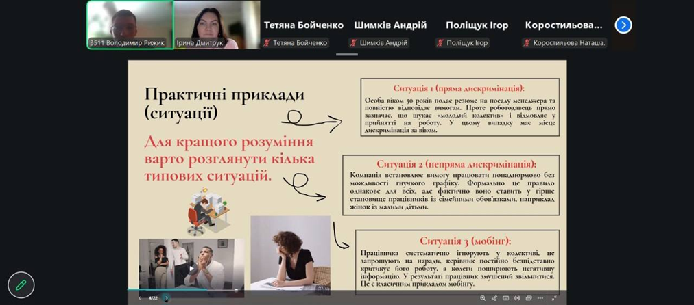Під керівництвом доцентки кафедри морського та господарського права НУК імені адмірала Макарова, кандидатки юридичних наук Дмитрук І.М., клініцисти навели приклади практичних ситуацій, що дозволило студентвм коледжу краще зрозуміти, як діяти у випадках дискримінації та ефективно захищати свої права.