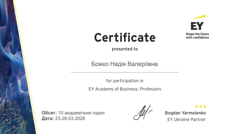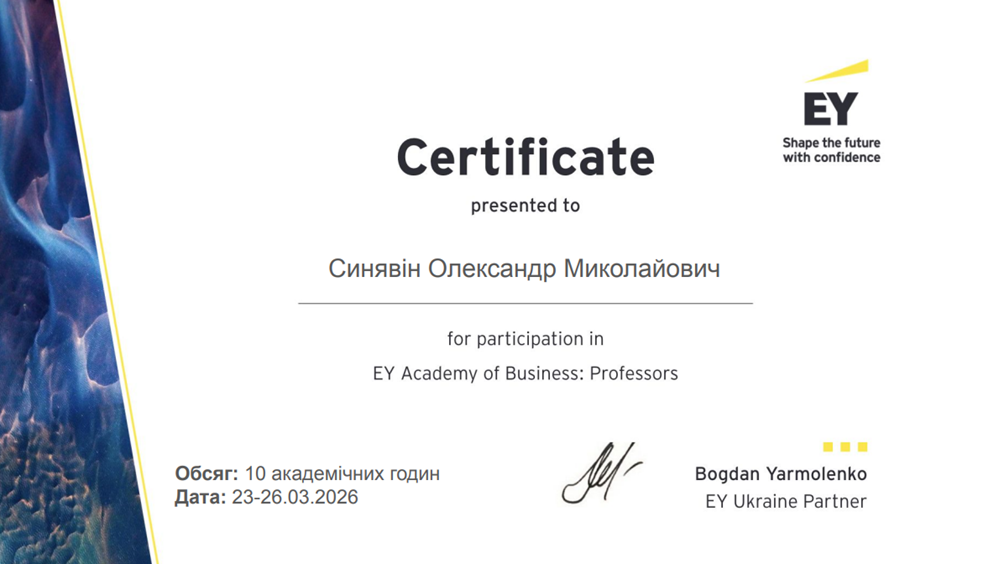 Викладачі нашого коледжу – Надія Валеріївна Божко та Олександр Миколайович Синявін – стали активними учасниками інтенсивної серії онлайн-зустрічей EY Academy of Business: Professors. Цей проєкт став майданчиком, де академічна база зустрілася з експертизою компанії EY – світового лідера у сфері аудиту, консалтингу та юридичних послуг. Протягом чотирьох насичених днів наші колеги занурювалися в сучасну бізнес-екосистему, щоб уже незабаром інтегрувати отриманий досвід у навчальні курси та зробити підготовку студентів ще більш конкурентоспроможною.