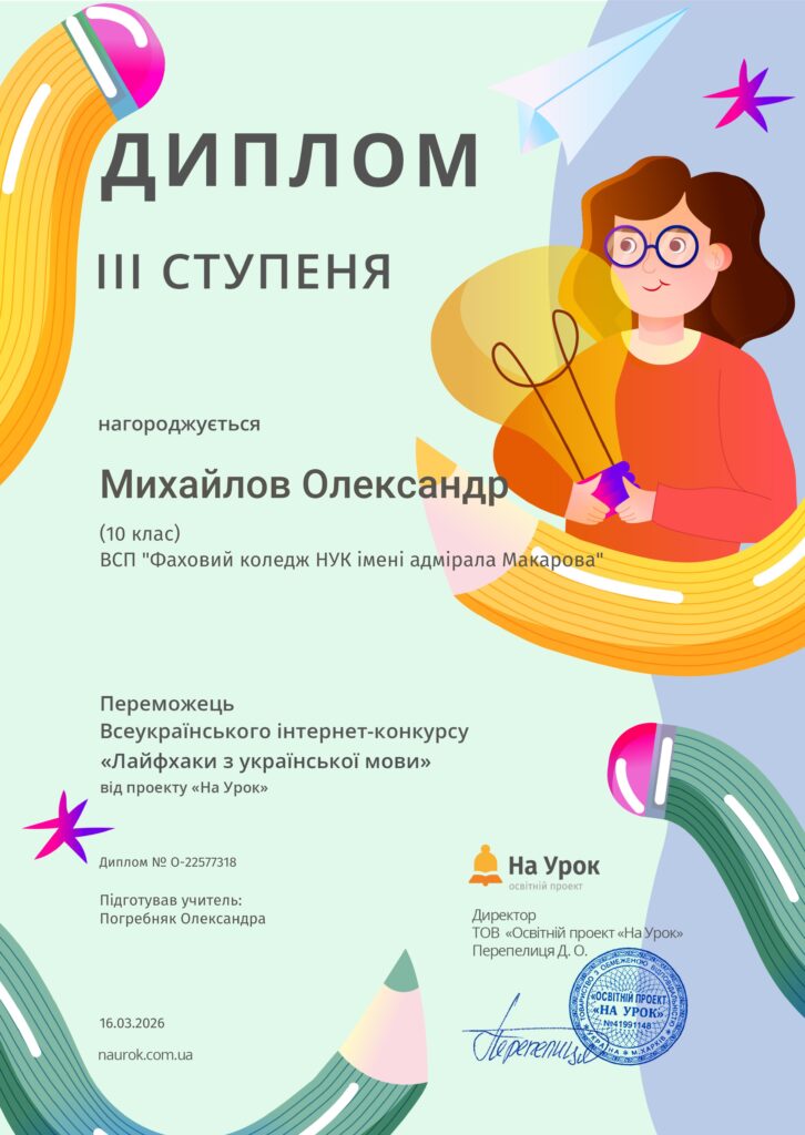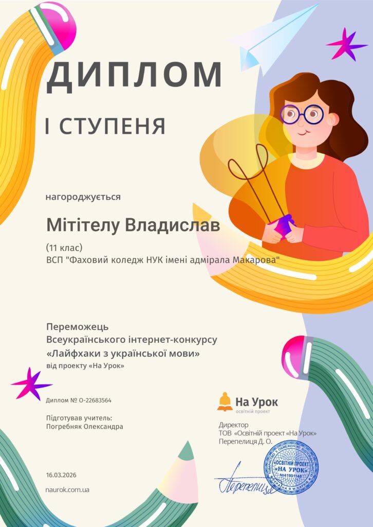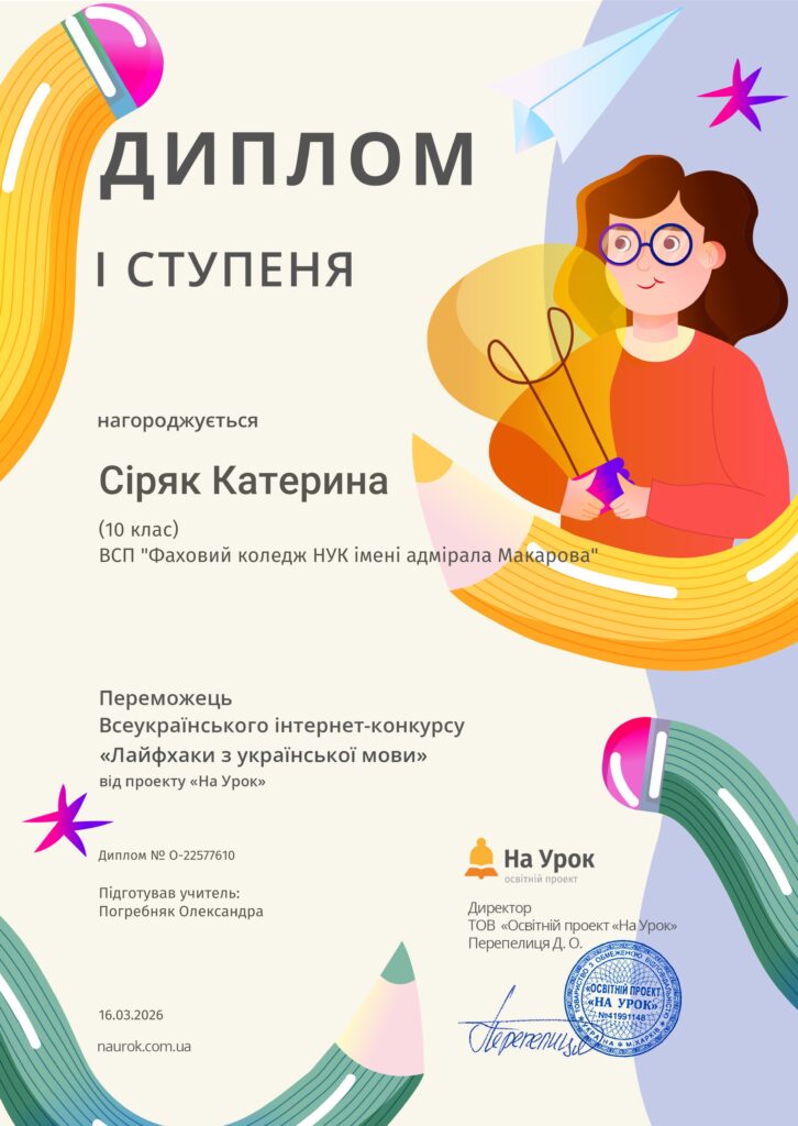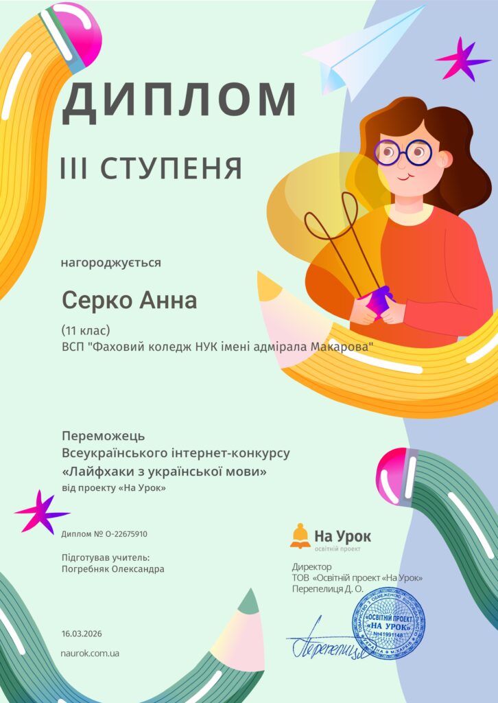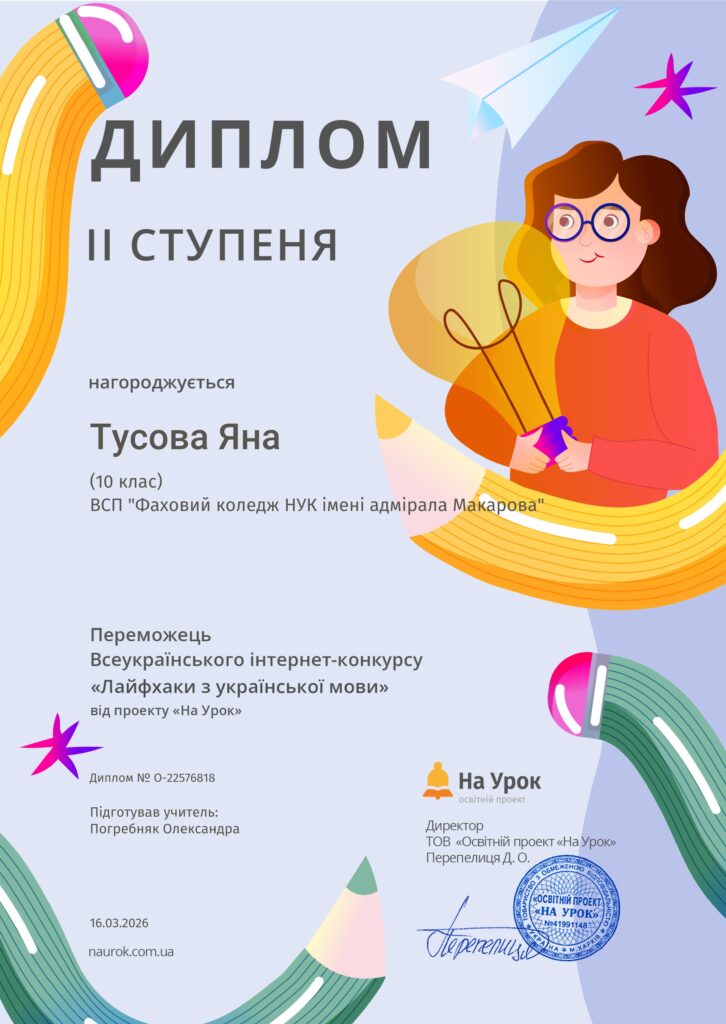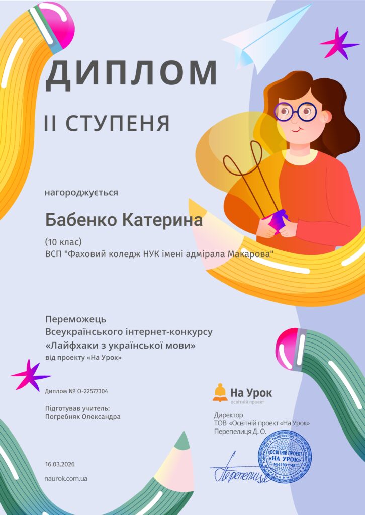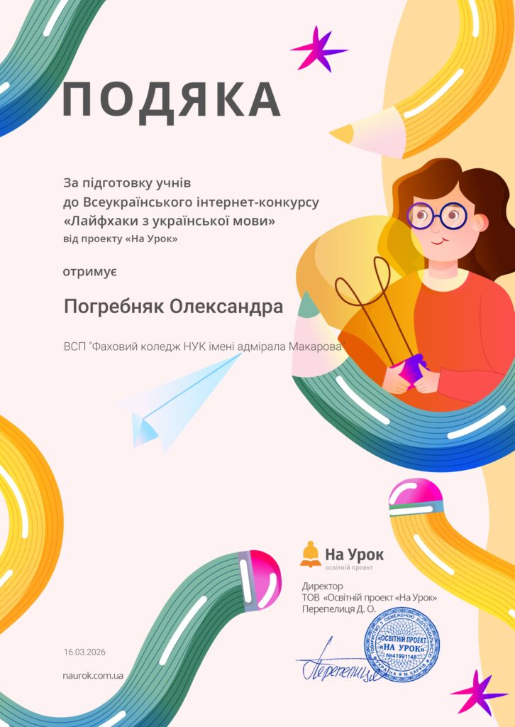 Студенти коледжу брали активну участь, під керівництвом викладачки української мови і літератури, Погребняк Олександри Олегівни, у Всеукраїнському конкурсі «Лайфхаки з української мови» та продемонстрували високий рівень знань і мовної культури.