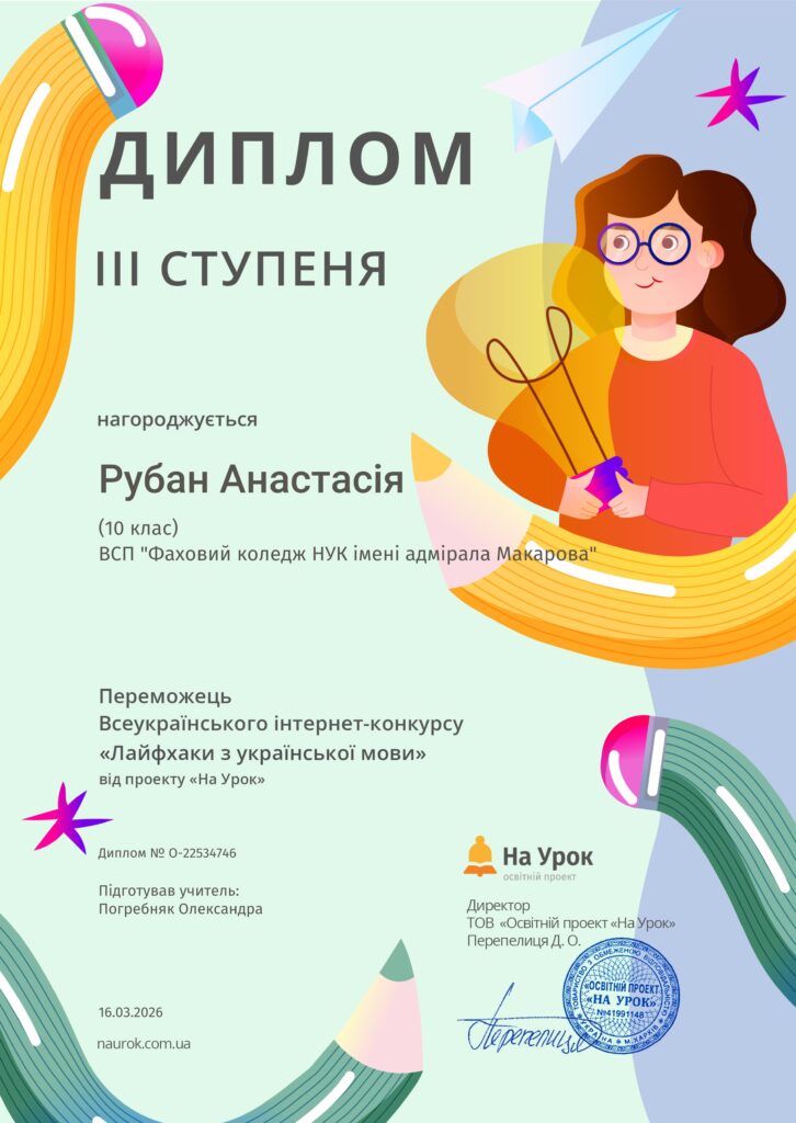 Особливо приємно відзначити, що наші студенти вибороли низку призових місць, підтвердивши свою мовну грамотність, уважність до слова й вміння практично застосовувати знання з української мови. Учасники продемонстрували не лише теоретичну підготовку, а й здатність аналізувати мовні явища, виправляти помилки й формувати правильне мовлення.