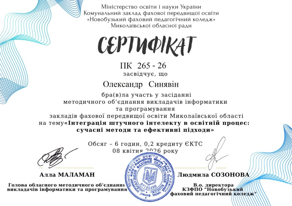 8 квітня 2026 року викладачі нашого коледжу Синявін О.М. та Божко Н.В. долучилися до масштабного обласного онлайн-заходу, присвяченого цифровій трансформації освіти. На базі Новобузького фахового педагогічного коледжу відбулося методичне об’єднання викладачів інформатики та програмування Миколаївської області, де ключовою темою стала інтеграція штучного інтелекту в освітній процес.