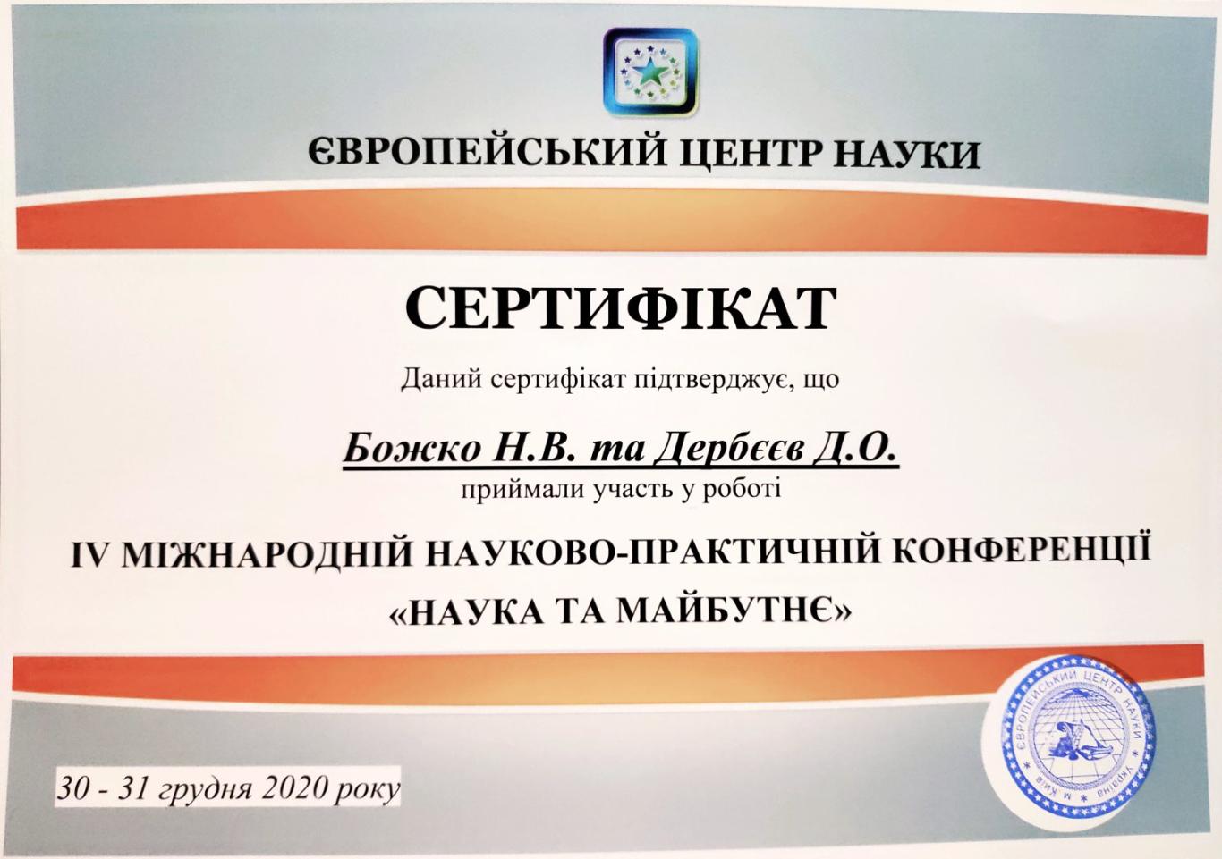 30-31 грудня 2020 року відбулася ІV Міжнародна науково-практична конференція «Наука та майбутнє» при підтримці Європейського центру науки, м. Київ, Україна.