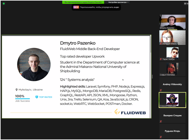 25 січня 2021 року у Відокремленому структурному підрозділі «Фаховому коледжі Миколаївського національного університету імені В.О.Сухомлинського» в рамках тижня технічної творчості «Професії майбутнього» відбулася онлайн зустріч з випускниками коледжу, які є співробітниками компанії Fluid Web – сервісної IT компанії, що допомагає інноваційним бізнес-проектам вийти на світовий рівень і реалізувати свої ідеї, які часто позитивно впливають на індустрію і навколишнє середовище.