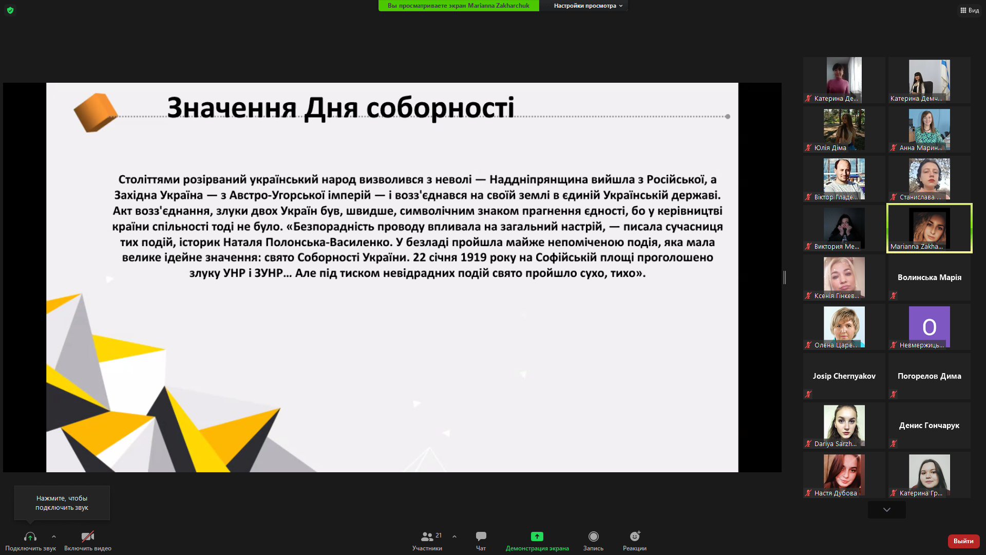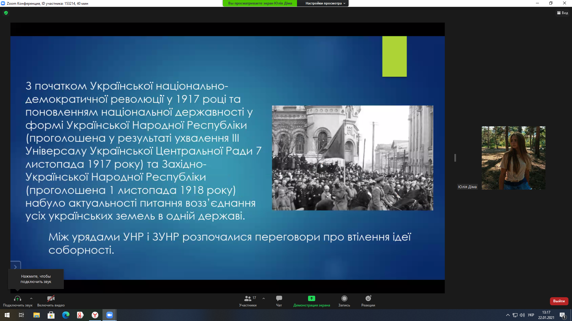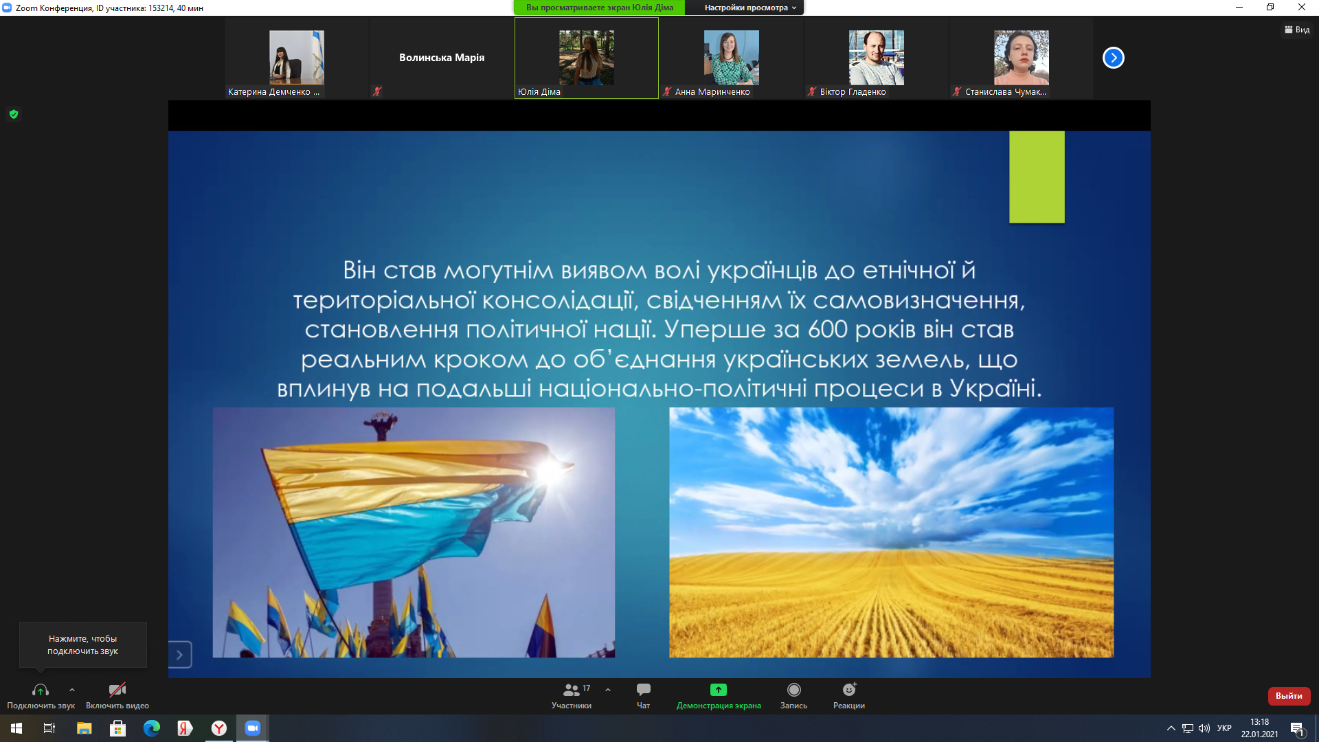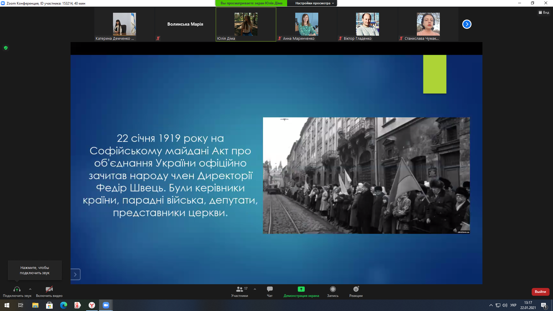 22 січня 1919 року на Софійській площі у Києві відбулося офіційне проголошення Акта Злуки: «Однині во єдино зливаються століттям одірвані одна від одної частини єдиної України – Західно-Українська Народня Республіка (Галичина, Буковина, і Угорська Україна) і Наддніпрянська Велика Україна. Здійснились віковічні мрії, якими жили і за які умирали кращі сини України. Однині є єдина незалежна Українська Народня республіка», – йшлося в Універсалі Директорії УНР. Наступного дня Всеукраїнський Трудовий Конгрес офіційно затвердив об’єднання західно- та східноукраїнських земель в одній державі.