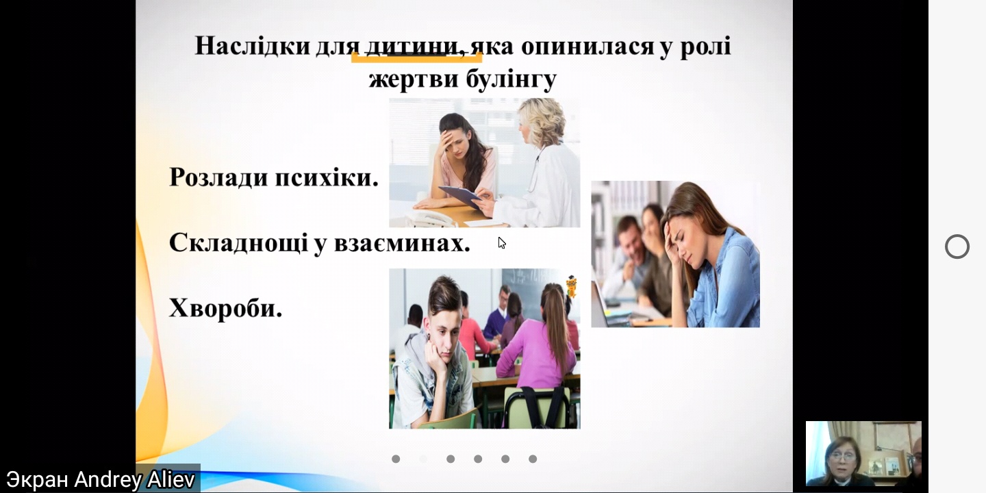 Модератор заходу, завідувач відділу соціокультурної діяльності молоді, Андрій Алієв допоміг нам розмежувати поняття булінг і конфлікт, ознайомив нас із ознаками булінгу та окреслив нам орієнтовний психологічний портрет учасників булінгу. Бібліотекар відділу соціокультурної діяльності молоді бібліотеки Марина Чередниченко, яка, до речі, практикує психологію, пояснила, якими можуть бути наслідки для дитини, яка стала об’єктом булінгу та як діяти дитині в такій ситуації.