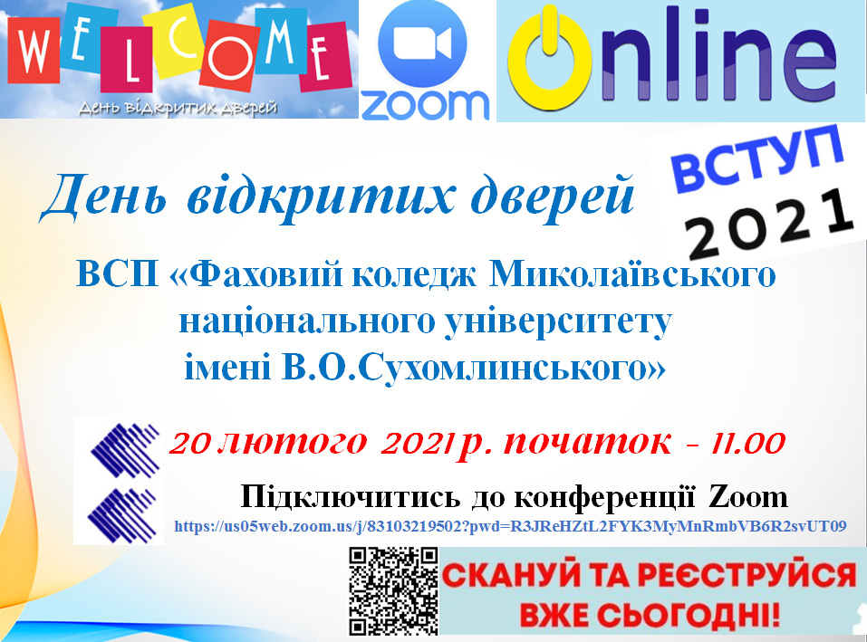 Відокремлений структурний підрозділ «Фаховий коледж Миколаївського національного університету В.О. Сухомлинського» запрошує учнів 9-11 класів загальноосвітніх шкіл, ПТНЗ та всіх бажаючих відвідати День відкритих дверей ONLINE!!!
