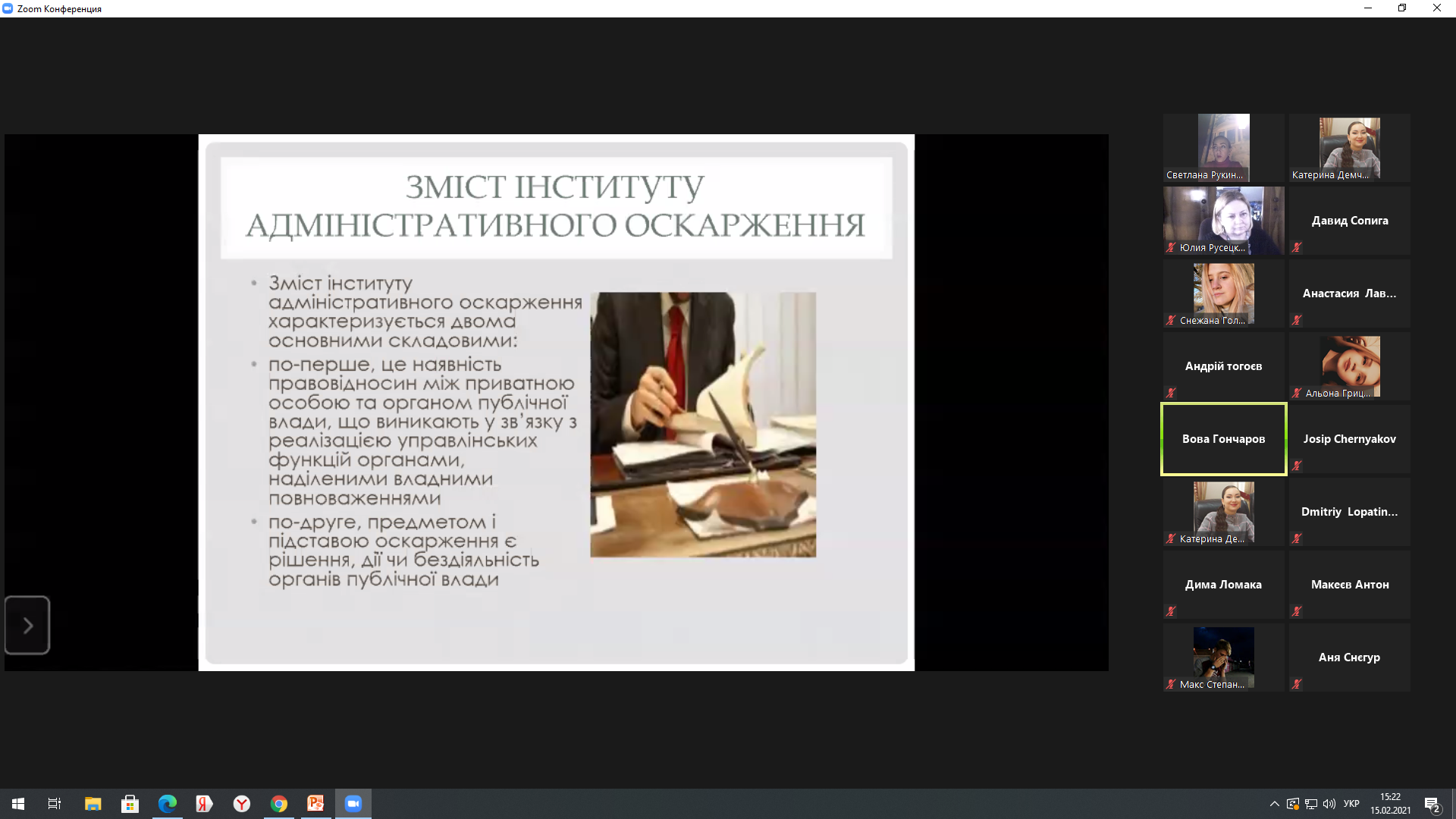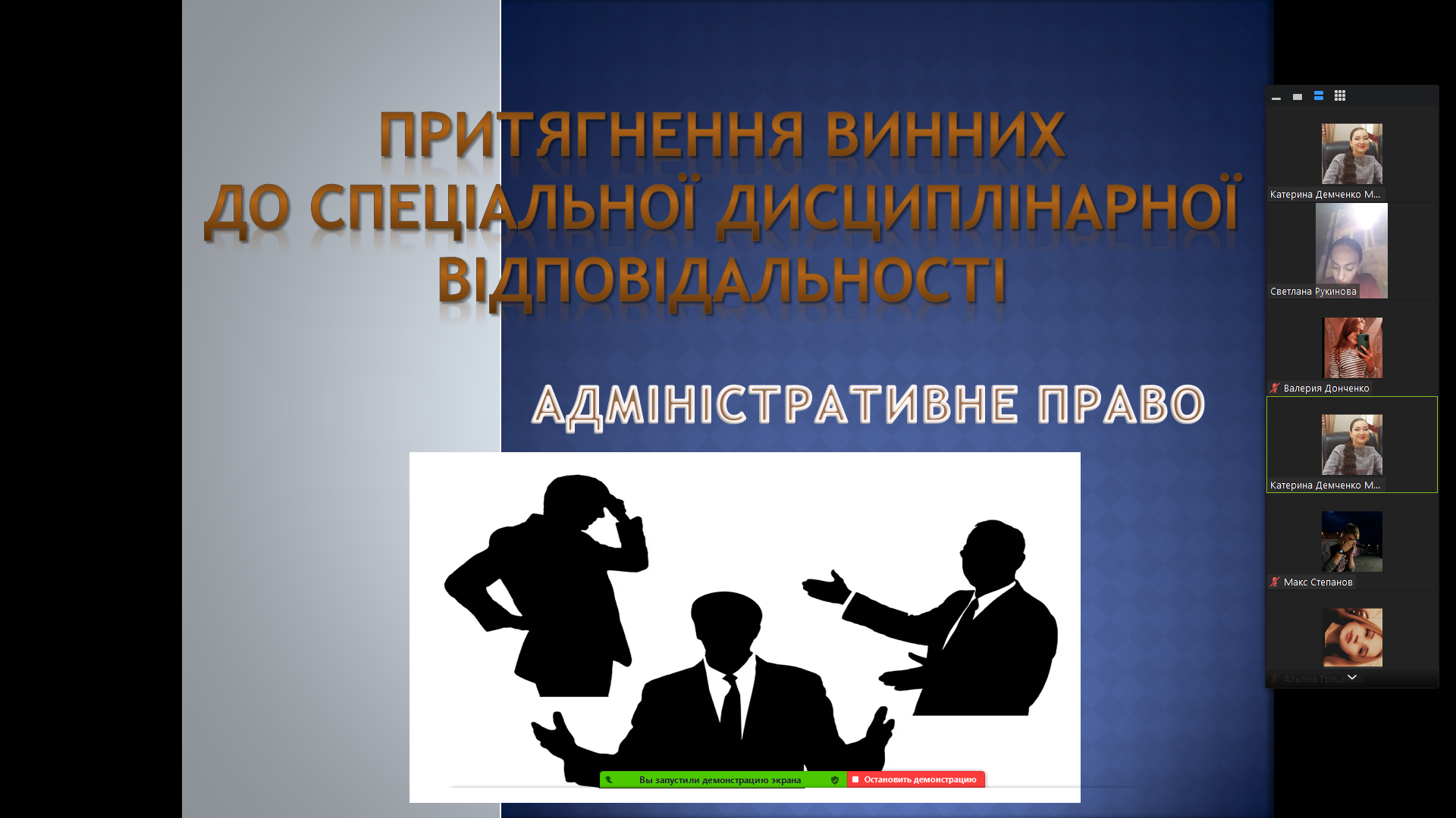 ДЕМЧЕНКО КАТЕРИНА, студентка 315 групи, спеціальності «Право» –Дисциплінарна відповідальність у адміністративному праві. Притягнення винних до спеціальної дисциплінарної відповідальності;