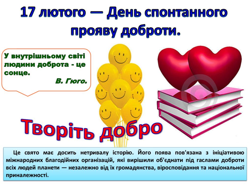 Спонтанні добрі вчинки можна робити не лише сьогодні, а й усі 365 днів на рік. Проявіть фантазію і не соромтеся робити світ кращим. Доброта врятує світ! Будьмо добрішими один до одного!