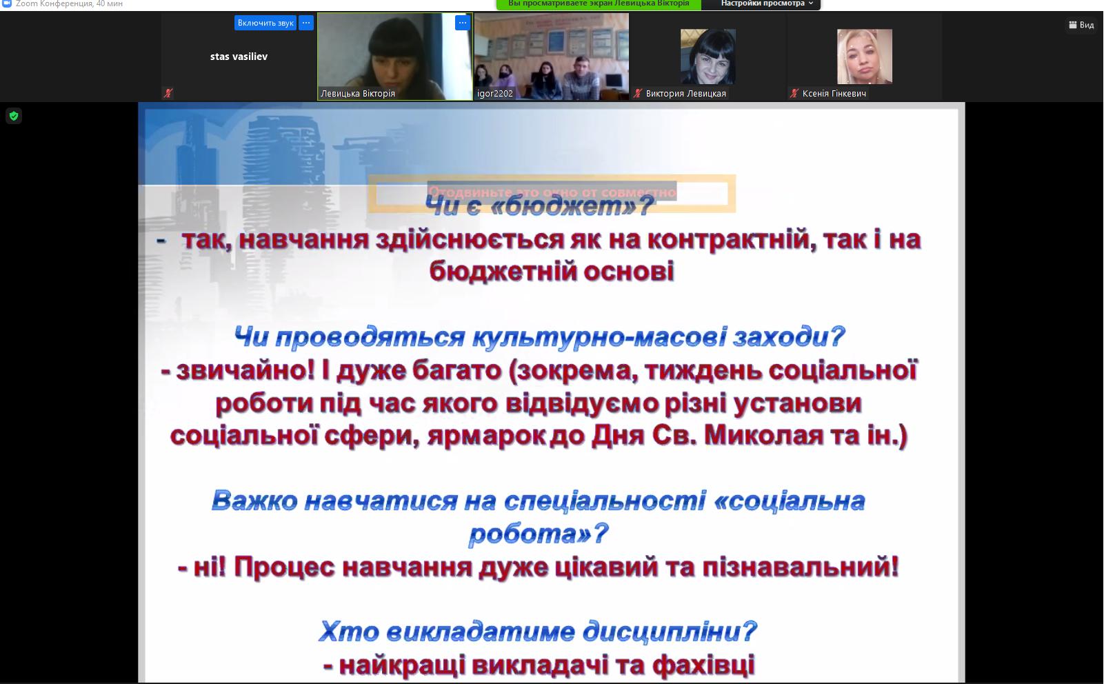 2 березня 2021 року у Відокремленому структурному підрозділі «Фаховому коледжі Миколаївського національного університету імені В.О.Сухомлинського» було проведено черговий профорієнтаційний захід. Зустріч з учнями Катеринівської ЗОШ І-ІІІ ступенів Веселинівського району було проведено за умовами карантинних вимог на платформі ZOOM. Комплексну кваліфіковану консультацію учням 9-х класів надали викладачі коледжу Левицька Вікторія Сергіївна та Гінкевич Оксана Валентинівна. Учні були досить активними і разом з учителем дізналися багато нового про наш навчальний заклад та особливості вступної кампанії 2021 року.