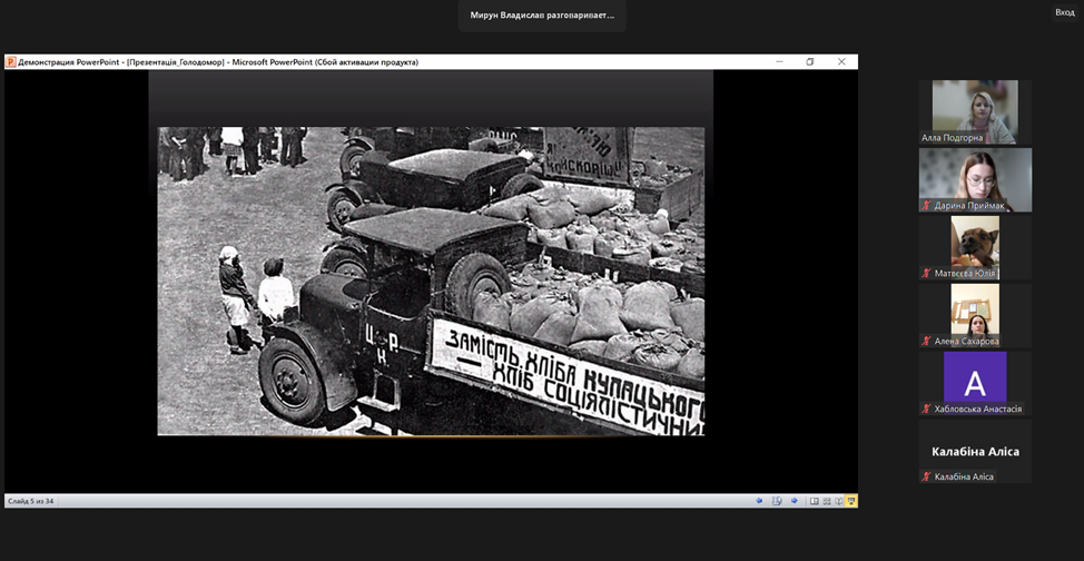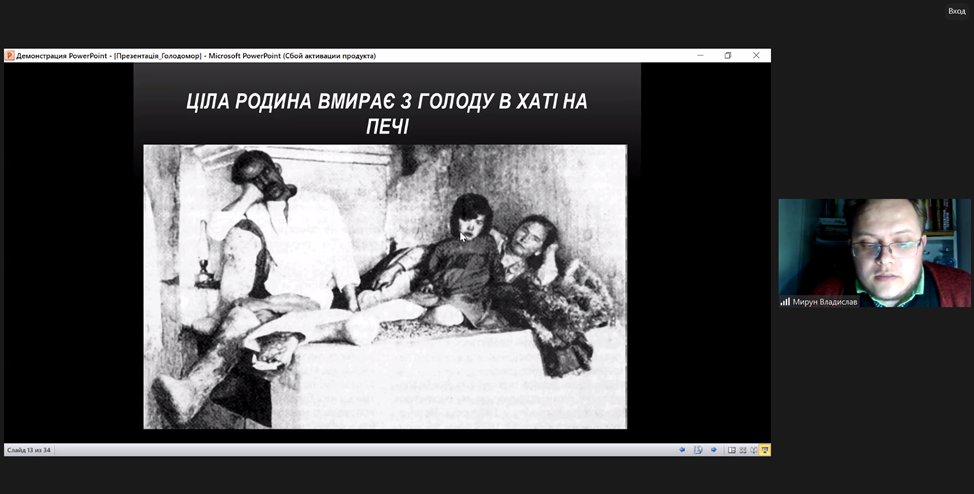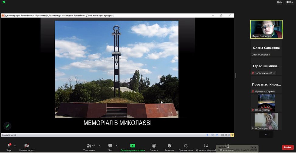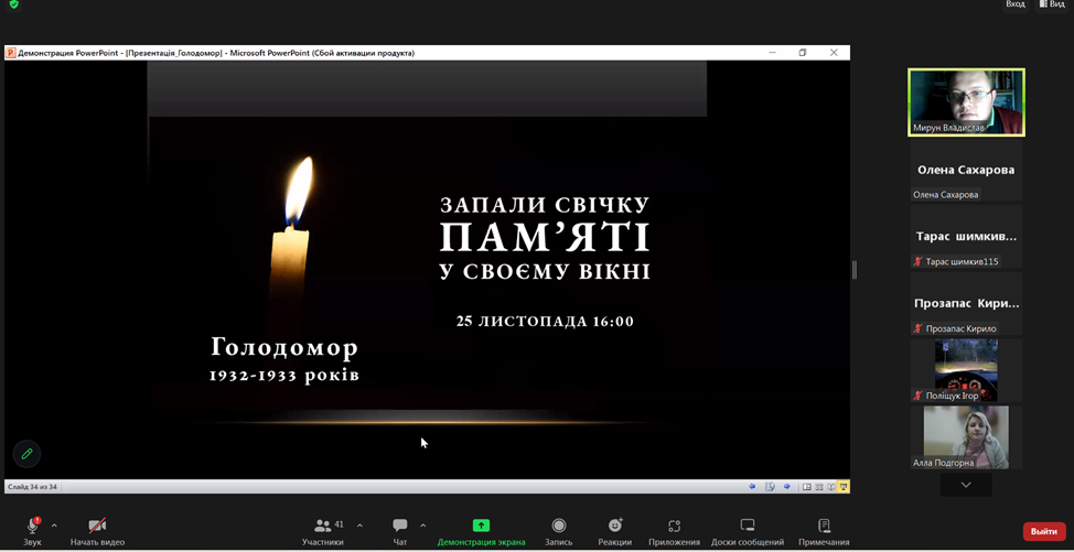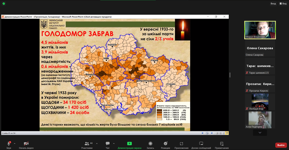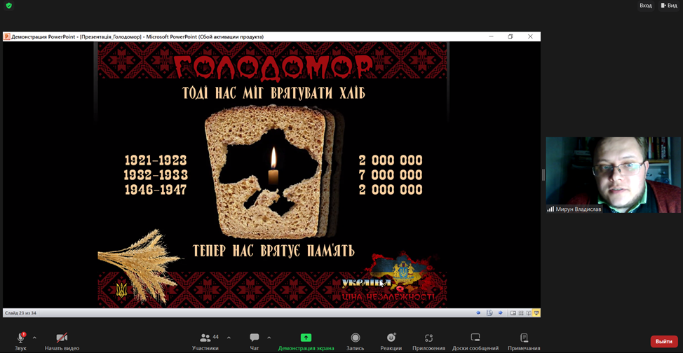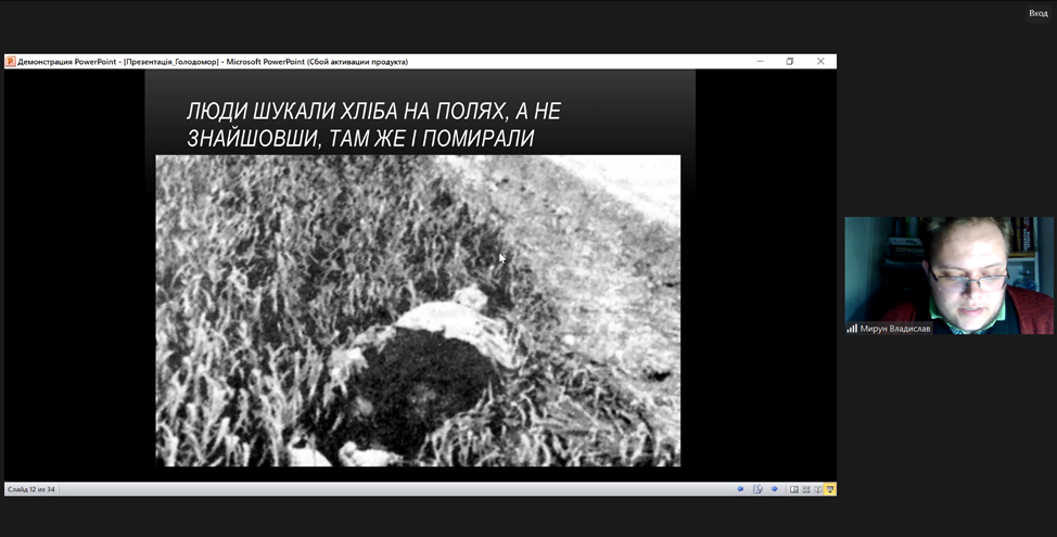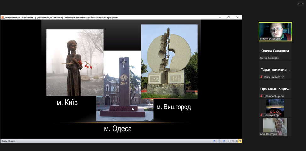 З метою гідного вшанування пам’яті жертв геноциду українського народу у ВСП «Фаховий коледж МНУ ім. В. О. Сухомлинського» викладачем Мируном Владиславом Віталійовичем було проведено онлайн-урок пам’яті «Голод – геноцид 1932-1933 років на Миколаївщині».