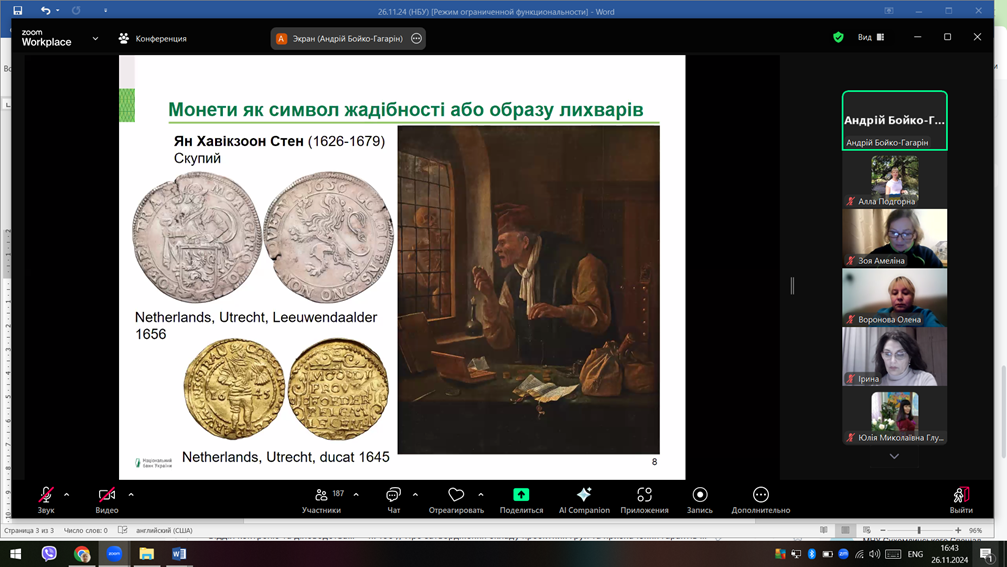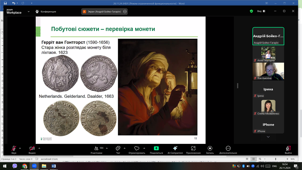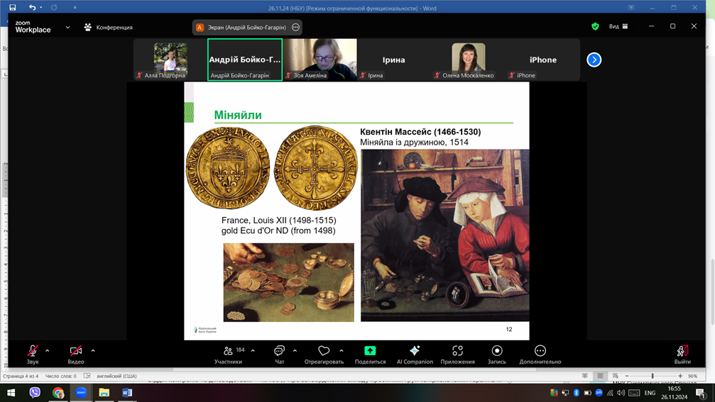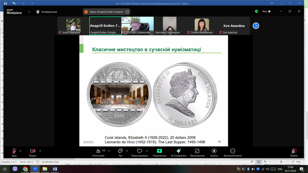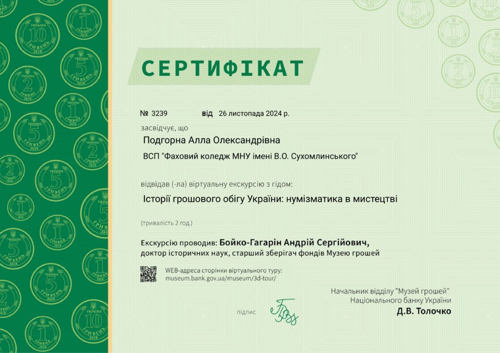 26 листопада 2024 р. викладачка фінансово-економічних дисциплін коледжу Алла Подгорна взяла участь у спеціальному віртуальному турі для освітян з теми «Історії грошового обігу України: нумізматика в мистецтві», організованим Національним банком України. На вебінарі було розглянуто матеріали щодо відображення грошей в мистецтві, зокрема виокремлено релігійний сюжет, побутовий сюжет; відображення монет в українському мистецтві – жіночі прикраси дукачі ХІХ ст. Окремо представлено класичне мистецтво в сучасній нумізматиці.