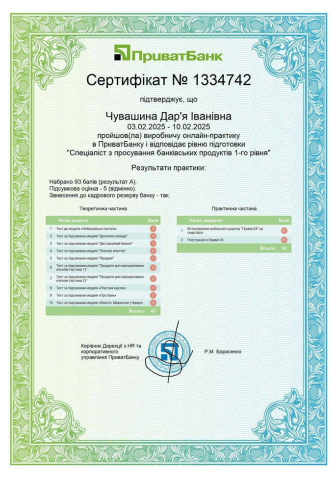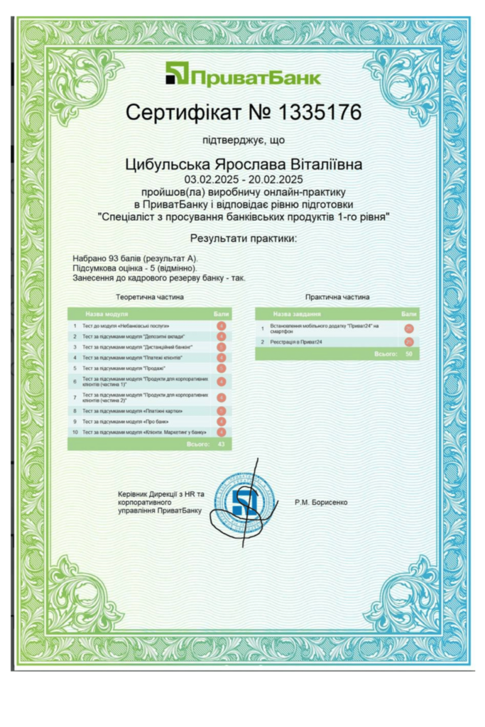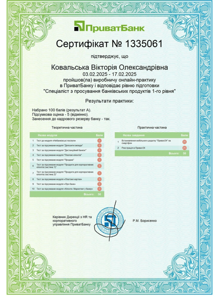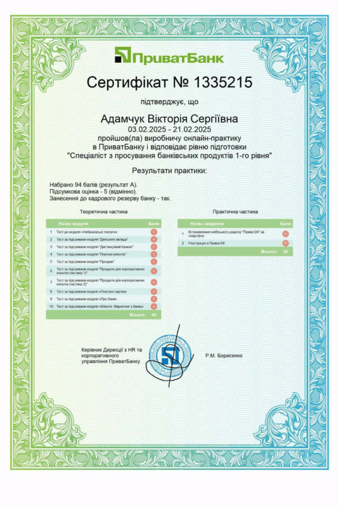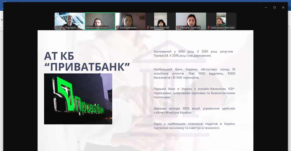 Проходження онлайн-практики від АТ КБ «ПриватБанк» для студентів сприяє підвищенню фінансової освіти на основі використання сучасних інформаційних технологій, формує навички дослідницького, пошукового характеру, розвиває практичні компетентності на основі отриманих знань, а також підвищує конкурентоспроможність випускників на ринку праці. Під час проходження онлайн-практики в АТ КБ «ПриватБанк» студенти повністю виконали Програму практики, виконавши всі тестові та практичні завдання від банку. Результатом успішно пройденої Програми практики банку стали сертифікати, що відповідають рівню підготовки «Спеціаліст з просування банківських продуктів 1-го рівня». Оскільки, студенти-практиканти, набрали за підсумками практики більше ніж 90 балів, тому були зараховані до кадрового резерву АТ КБ «ПриватБанк», що дає можливість працевлаштування у банку після завершення навчання.